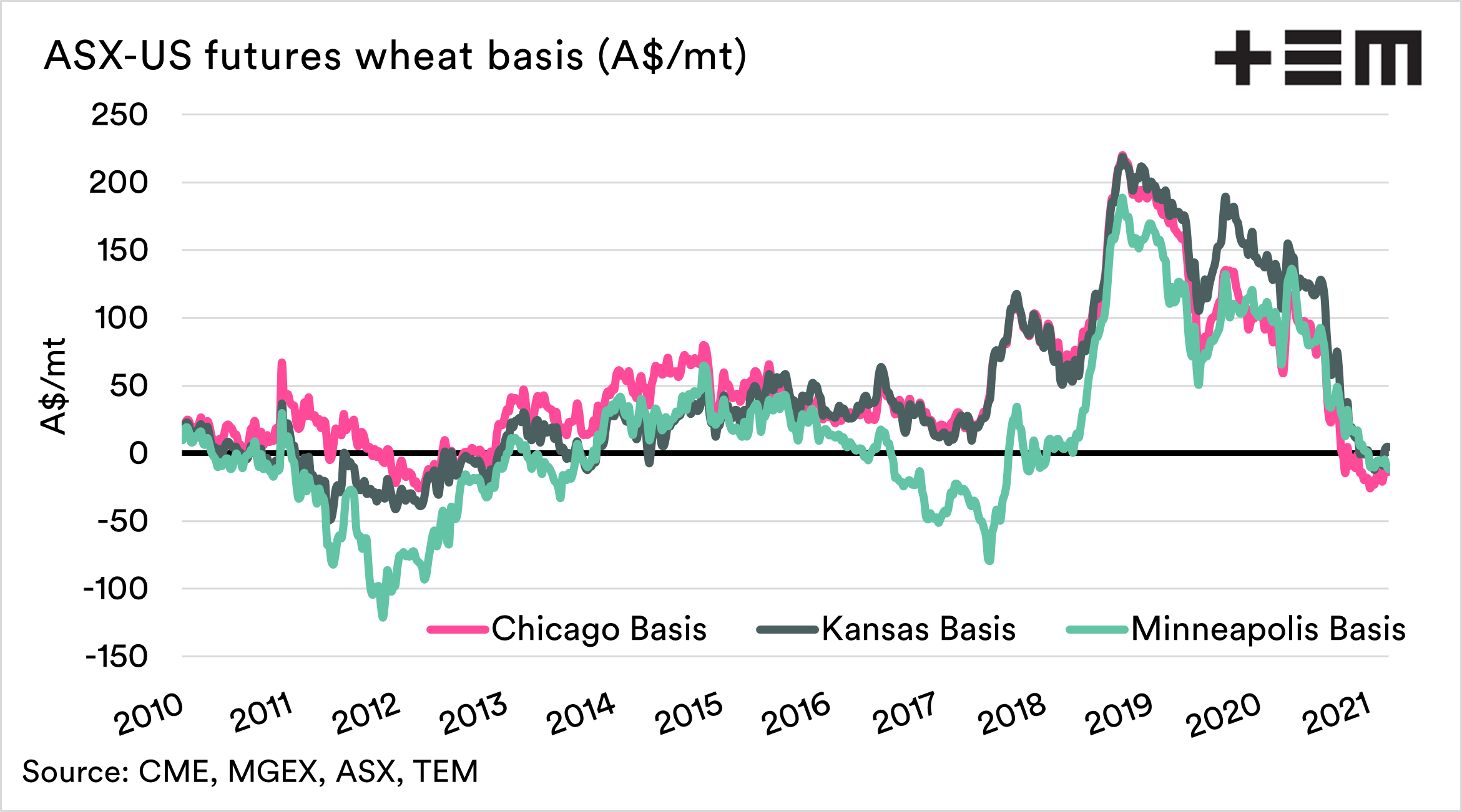 There is more than one futures exchange to hedge wheat; in the third chart, the basis between ASX and Kansas, Minneapolis and Chicago is displayed. In the past ten years, ASX has experienced longer periods of discount to Minneapolis, when spring wheat crops conditions in the US have deteriorated.