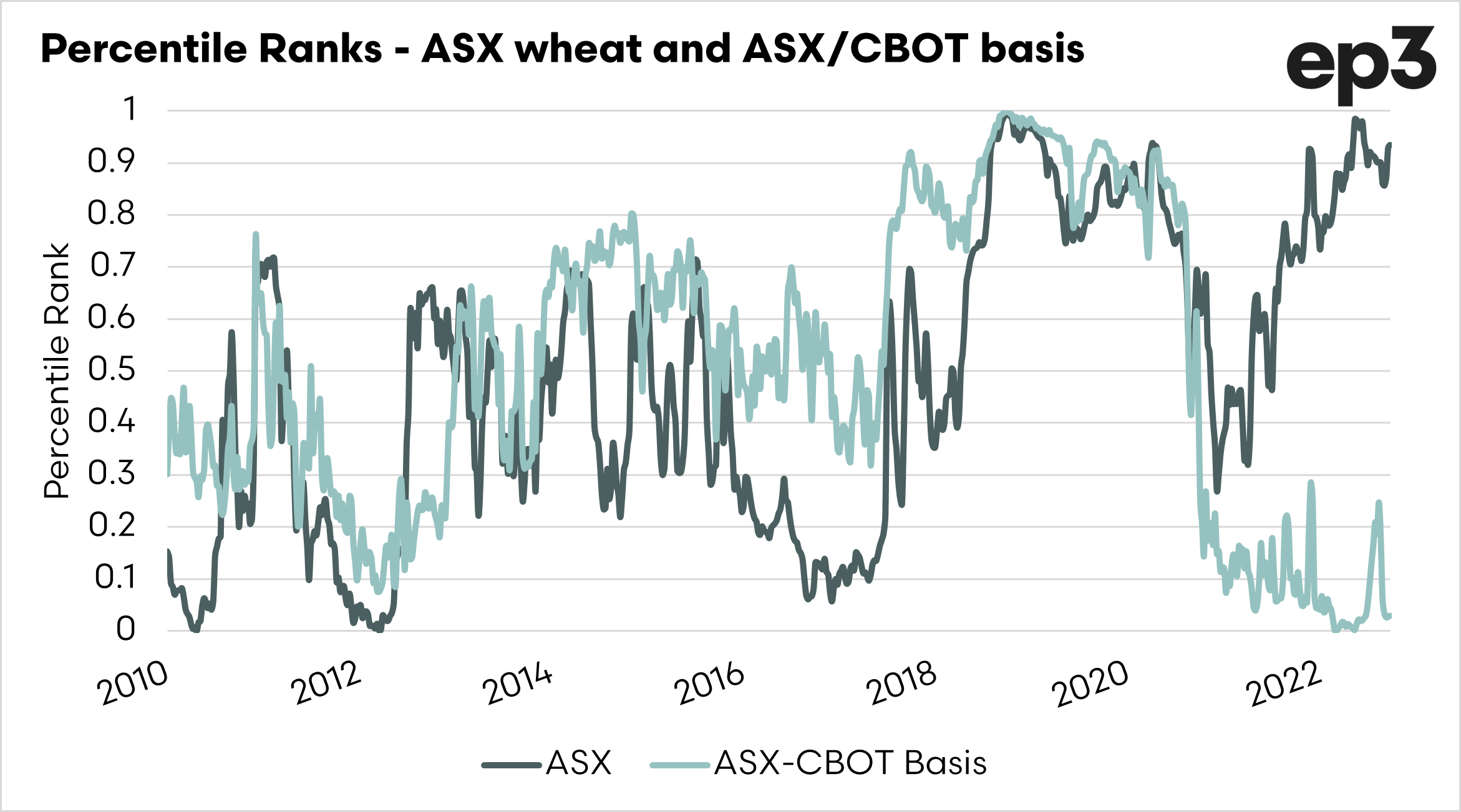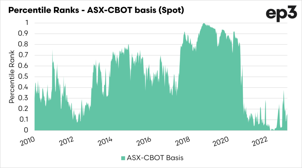 To look at how our basis compares to history, I have opted to display this as a percentile ranking. A rank of 1 equates to the highest basis level (or premium) and 0 equates to the lowest basis level (or discount).