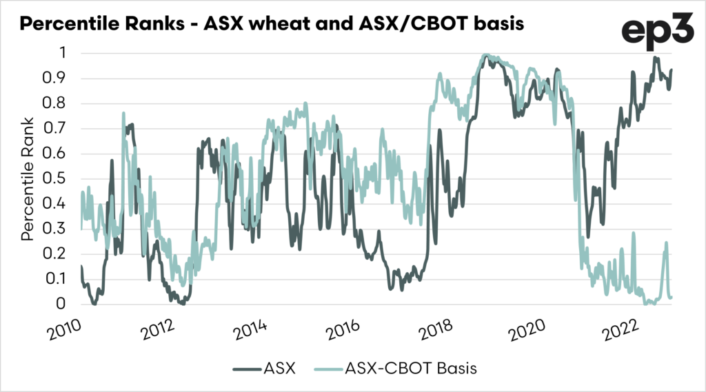 The second chart below is interesting, as it displays the basis percentile ranking but also the price ranking of wheat.