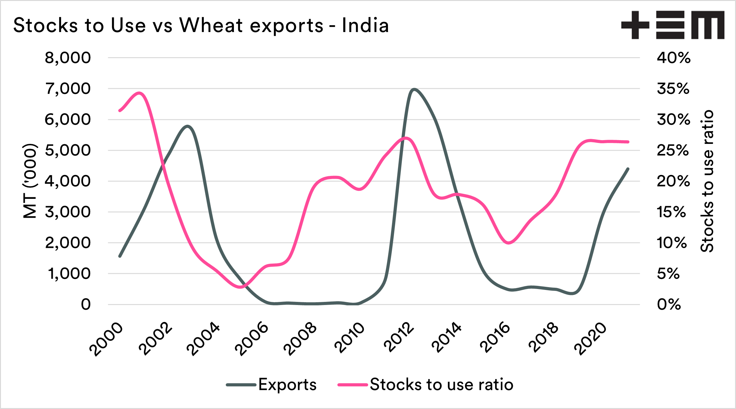 This can be seen, to an extent, in the second chart below. This shows the annual exports vs the decile of annual pricing (using CBOT as a proxy for global pricing). In the third chart below, which compares the Indian stocks to use ratio vs exports.