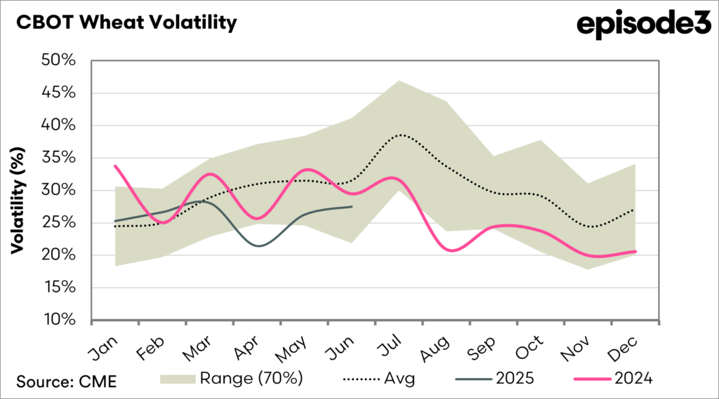 This time of year is typically when volatility increases in the wheat market, but in 2025, volatility has been lower than expected.