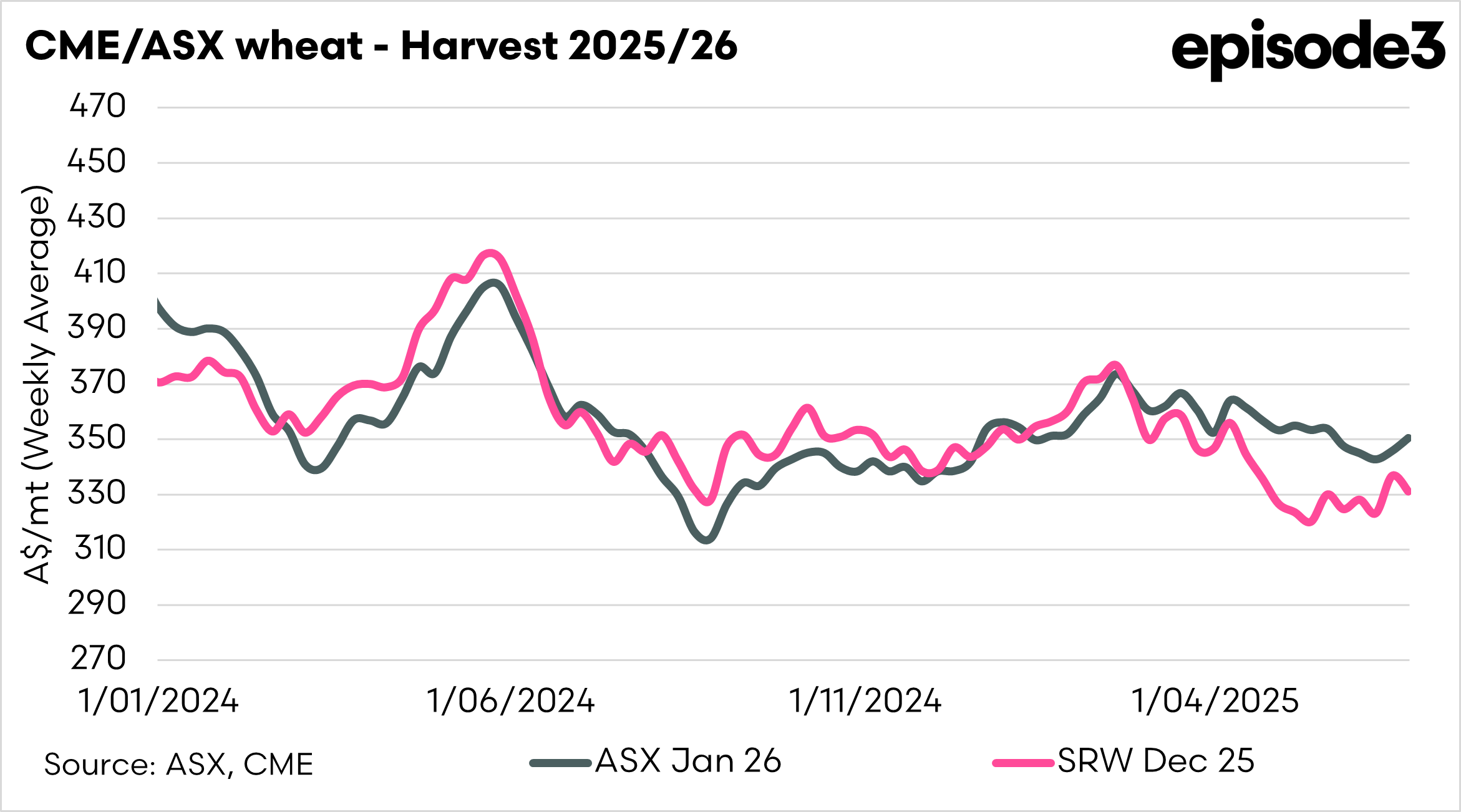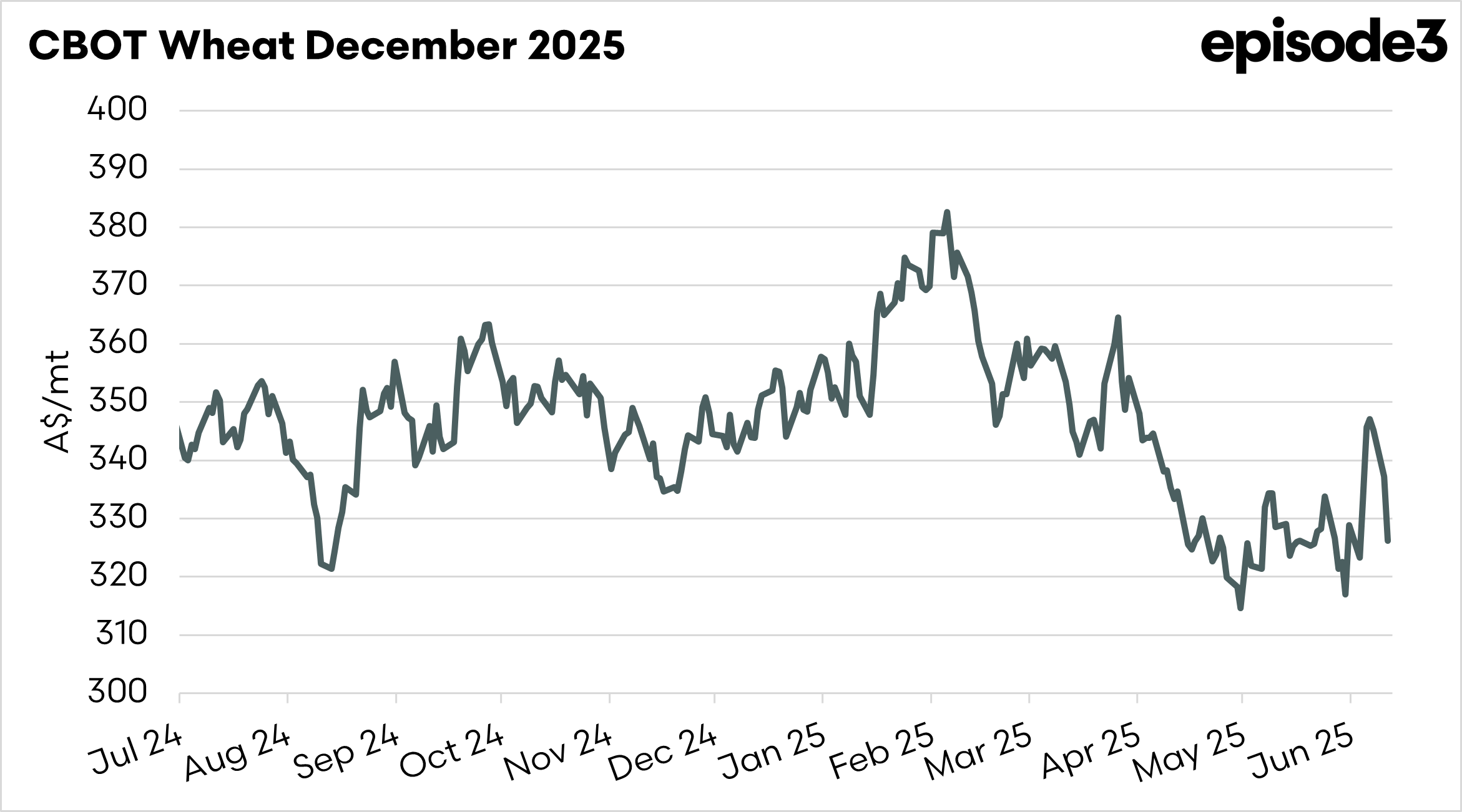 CBOT Wheat for the coming harvest rose from A$316 to A$347, it has now fallen back to A$326.