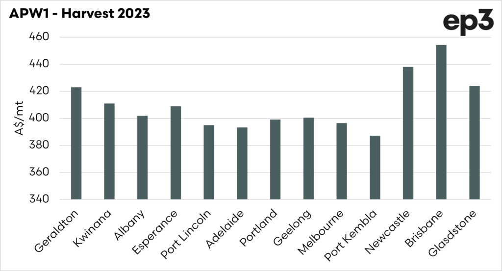 We can see that the wheat price in Brisbane rose to a stratospheric high during the last drought. This is caused by domestic consumers paying up to ensure that they gain access to grain.