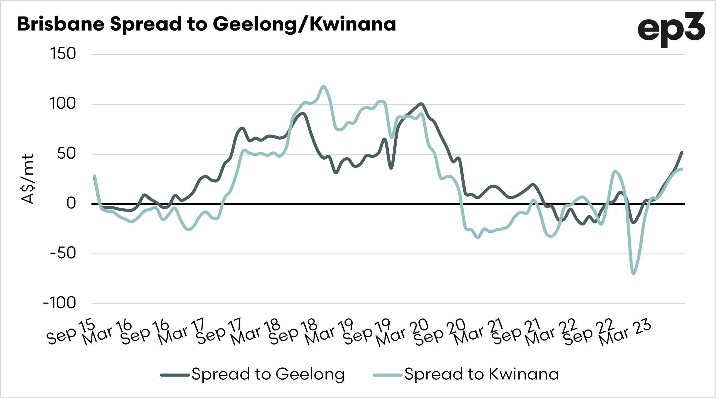 The first chart below shows that the domestic premiums are being paid in these markets. The second chart shows the spread between Brisbane and Geelong/Kwinana since 2015.