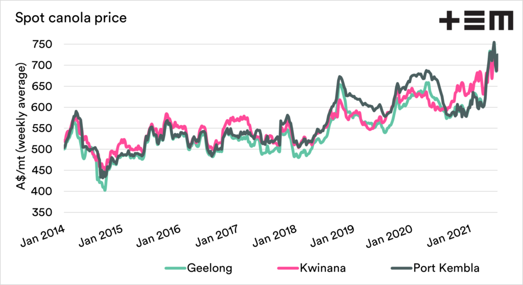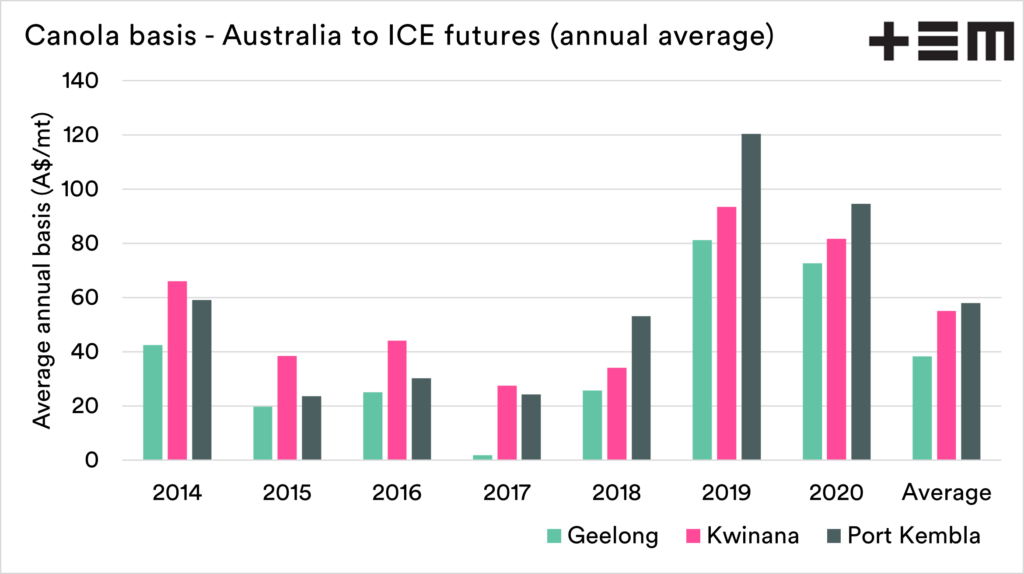 In recent canola articles, I have discussed the basis levels between Australia and ICE canola (see here). In summary, Australian prices are trading at a discount compared to our normal premium. A price of A$705/mt excludes basis, and Kwinana, as an example, has averaged +A$55 since 2014.
