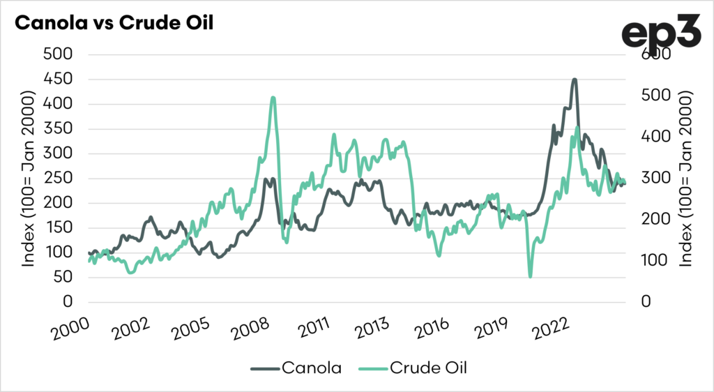 Many grains/oilseeds are used for biofuel purposes; therefore, they are a replacement for crude oil. The relationship between canola and wheat with crude oil can be seen in the charts below.