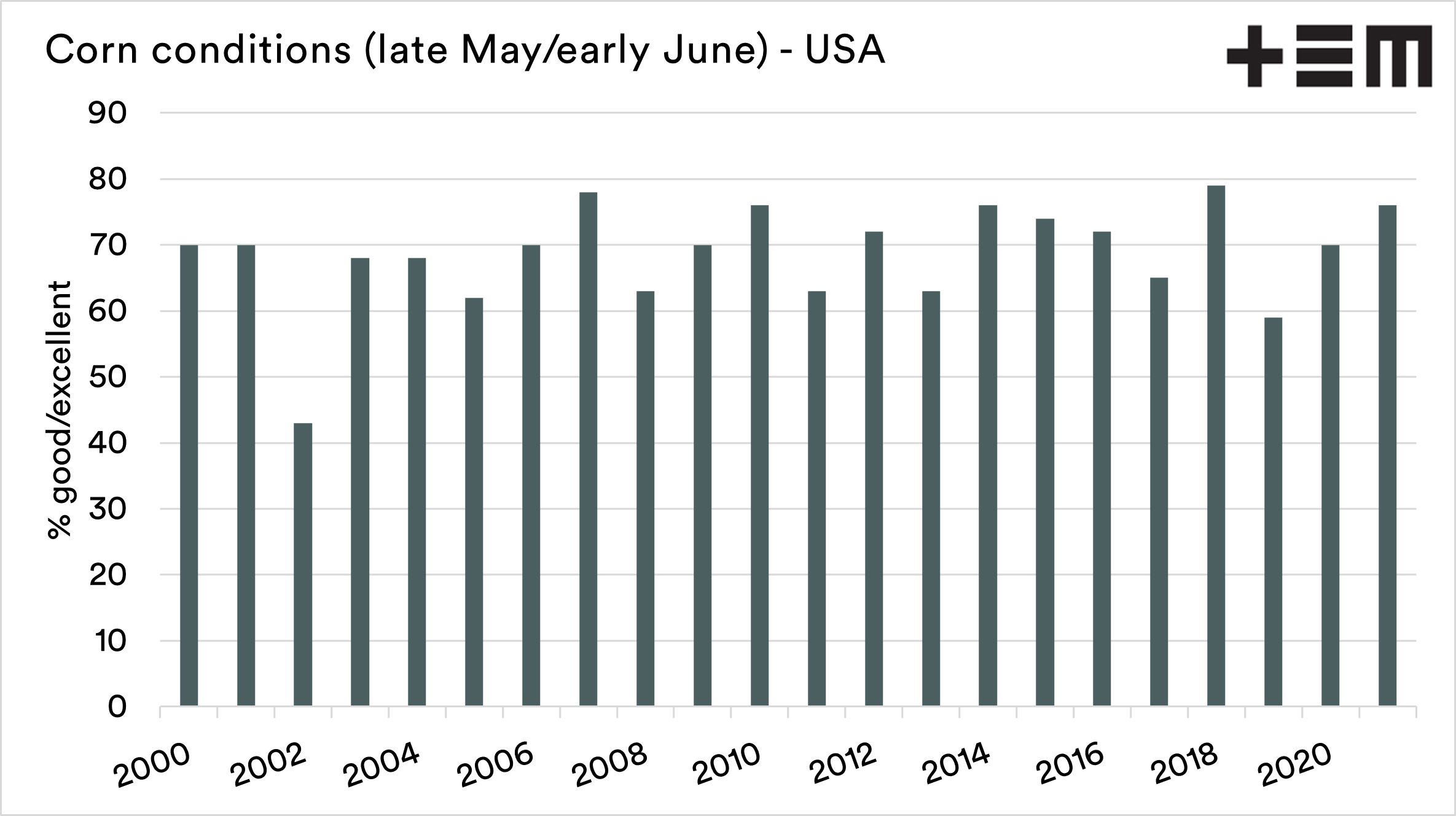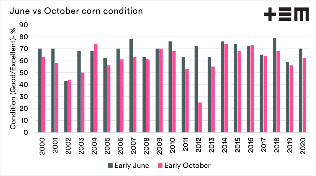 The overall corn condition is fantastic, with 76% of the crop in good or excellent condition. As a comparison against the late May/early June conditions reports going back to 2000, 2021 is in joint 3rd place (alongside 2010 & 2014).