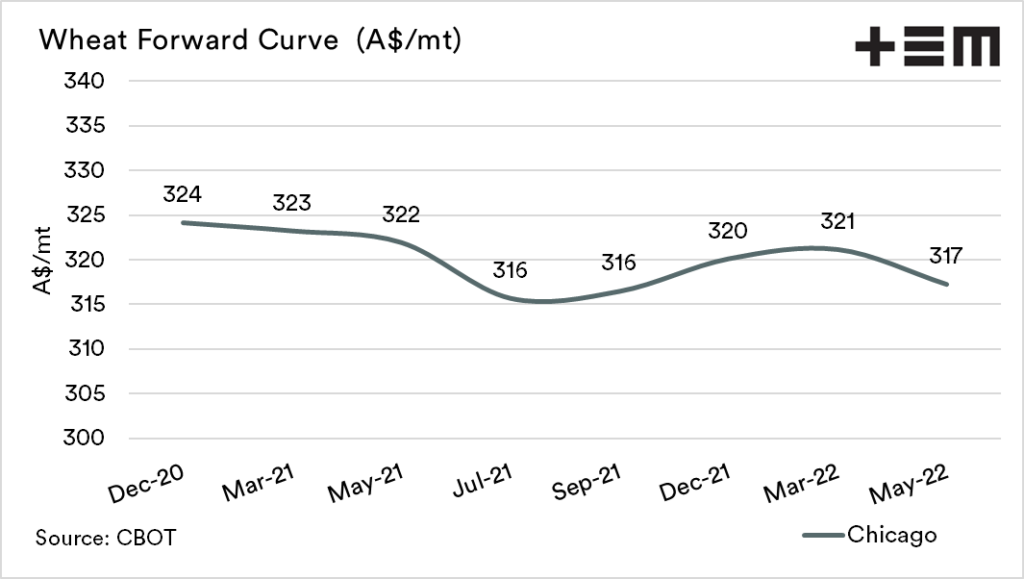 I highlighted ‘tends’ in the previous paragraph as the market has gone into a slight backwardation. At present, the market is paying A$324 for December 2020 wheat futures but is discounted to A$316 for July 2021.