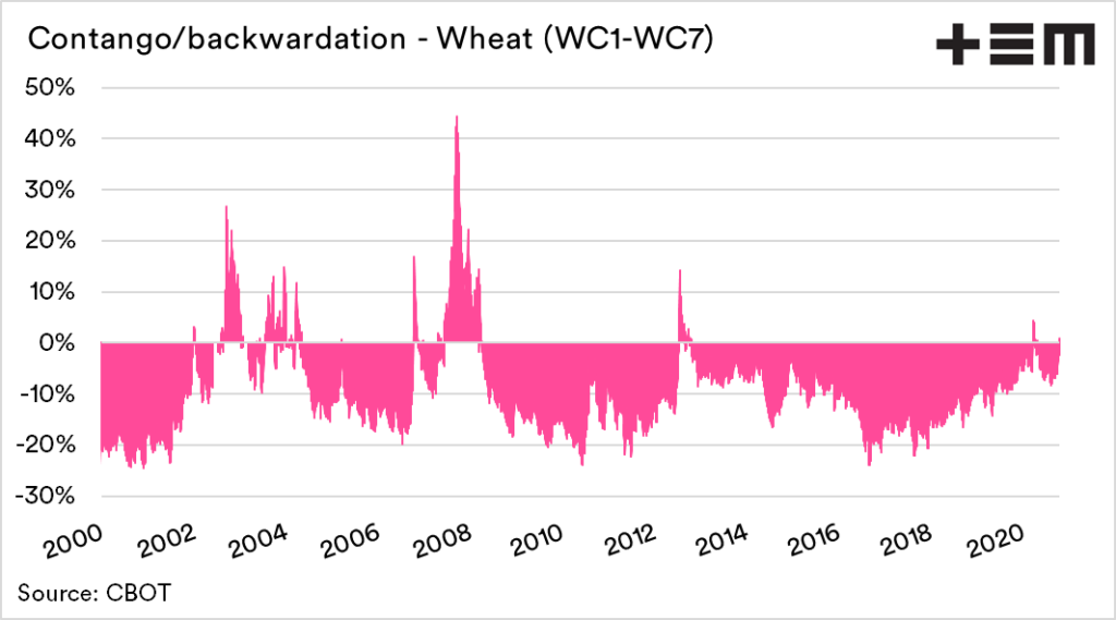 The second chart below shows how often that CBOT wheat futures are in backwardation. This chart represents the difference in price (%) between the spot contract (WC1) and seven contract months ahead (WC7).