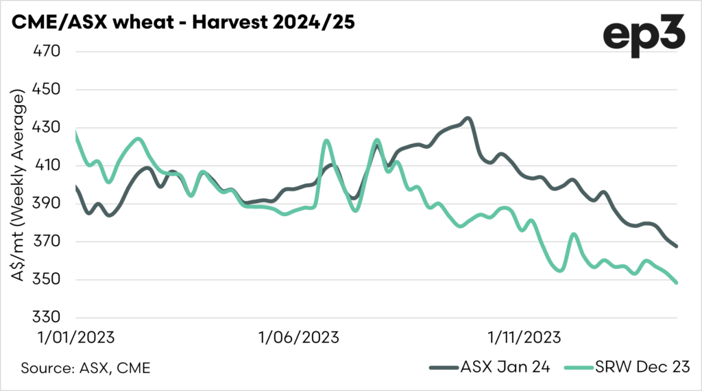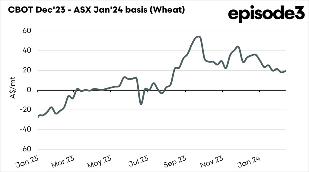 ASX, which is representative of Aussie prices, has moved to a premium. The ASX price is A$368 for the coming harvest, and the premium is A$19 over Chicago wheat.
