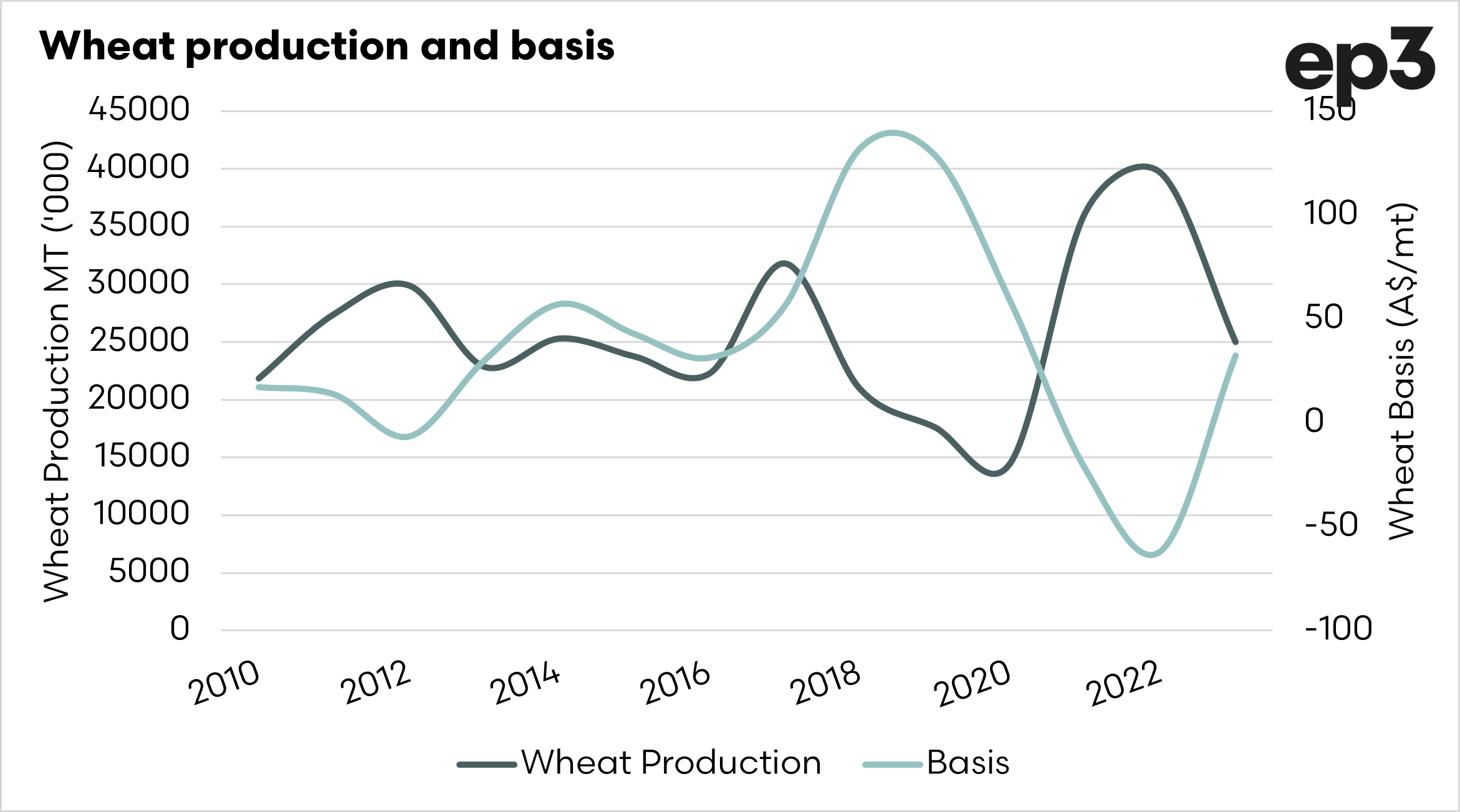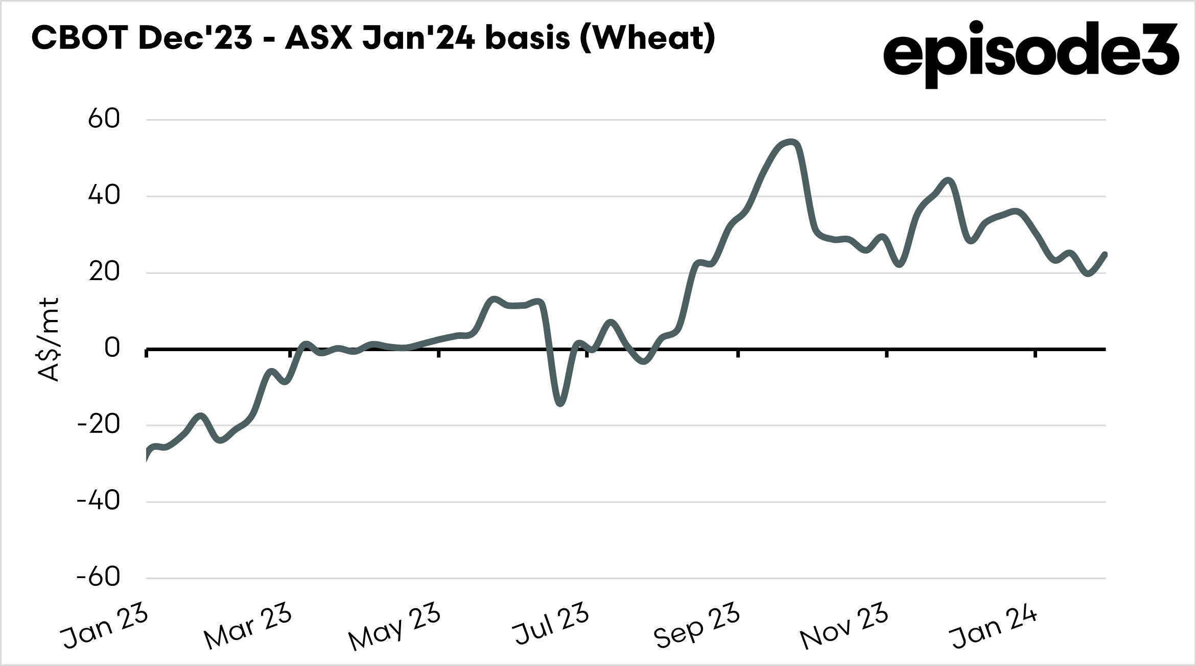 The Australian contract is currently trading at a premium to the Chicago contract. This basis will likely drop to a discount in our hypothetical bumper crop scenario.