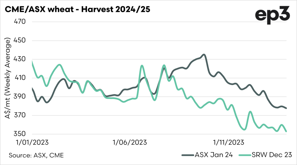 The chart above shows the ASX and CBOT wheat contracts for the coming harvest. I am using the ASX contract as an easy representation of Australian wheat, but it could in reality, be a physical contract with your local buyer.