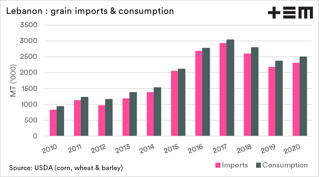 Lebanon imports the majority of its grain through the Beirut port, where it is stored in one central silo (120kmt). This silo is effectively ruined, causing a potential food crisis for the coming year.