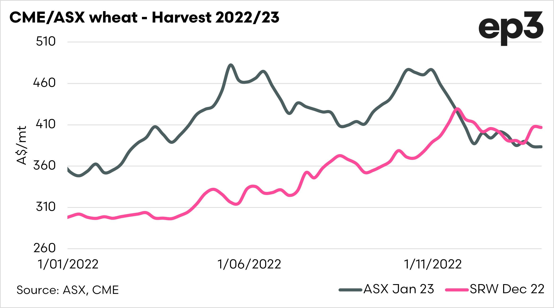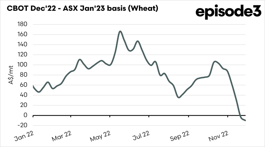 This is a large drop from the highs in October but remains a historically high number. The important point to note is that the current pricing for next year is showing a negative basis. This is generally unusual because we don’t know yet whether Australia will be a bumper or bust for 2023/24.