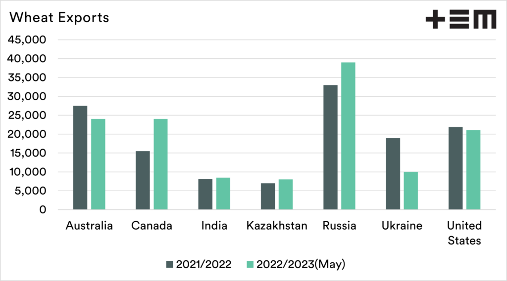 Wheat is a highly prized and priced commodity at the moment. The pricing is a signal for export nations to get ships loaded and out as soon as possible. This is leading to record-high exports on a global level. The main exporters are shown in the chart below.