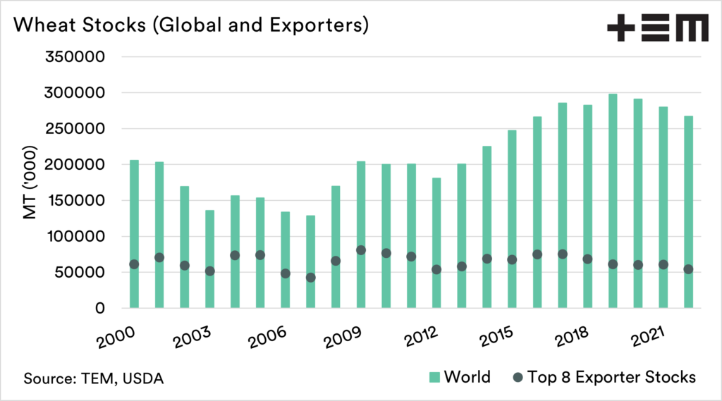 The first chart below shows the world wheat stocks, versus the stocks from the top 8 exporters. The top exporters are set to have the lowest stocks since 2012.