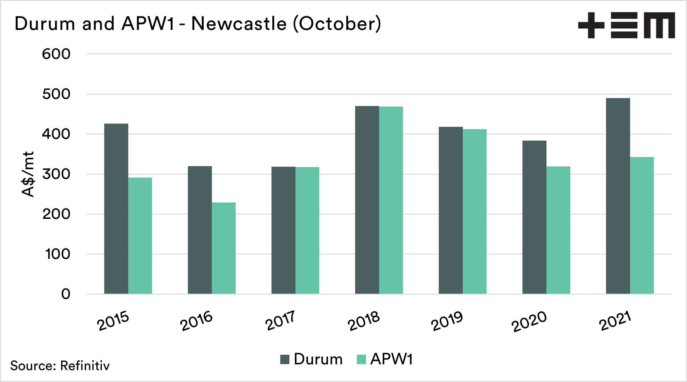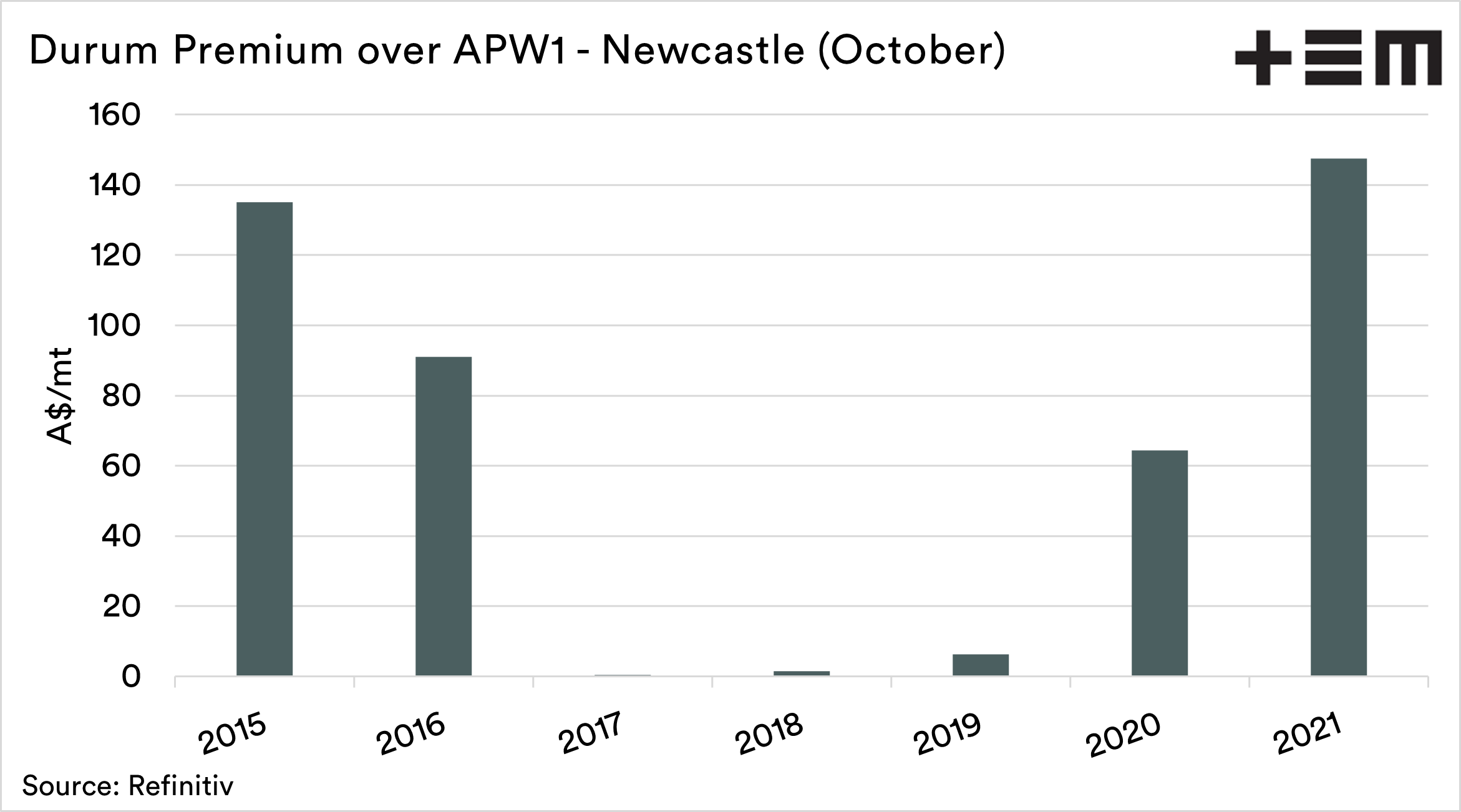 In the second chart below, the Durum and APW1 price is shown as an average for October going back to 2015. We can see that the premium has grown dramatically this year.