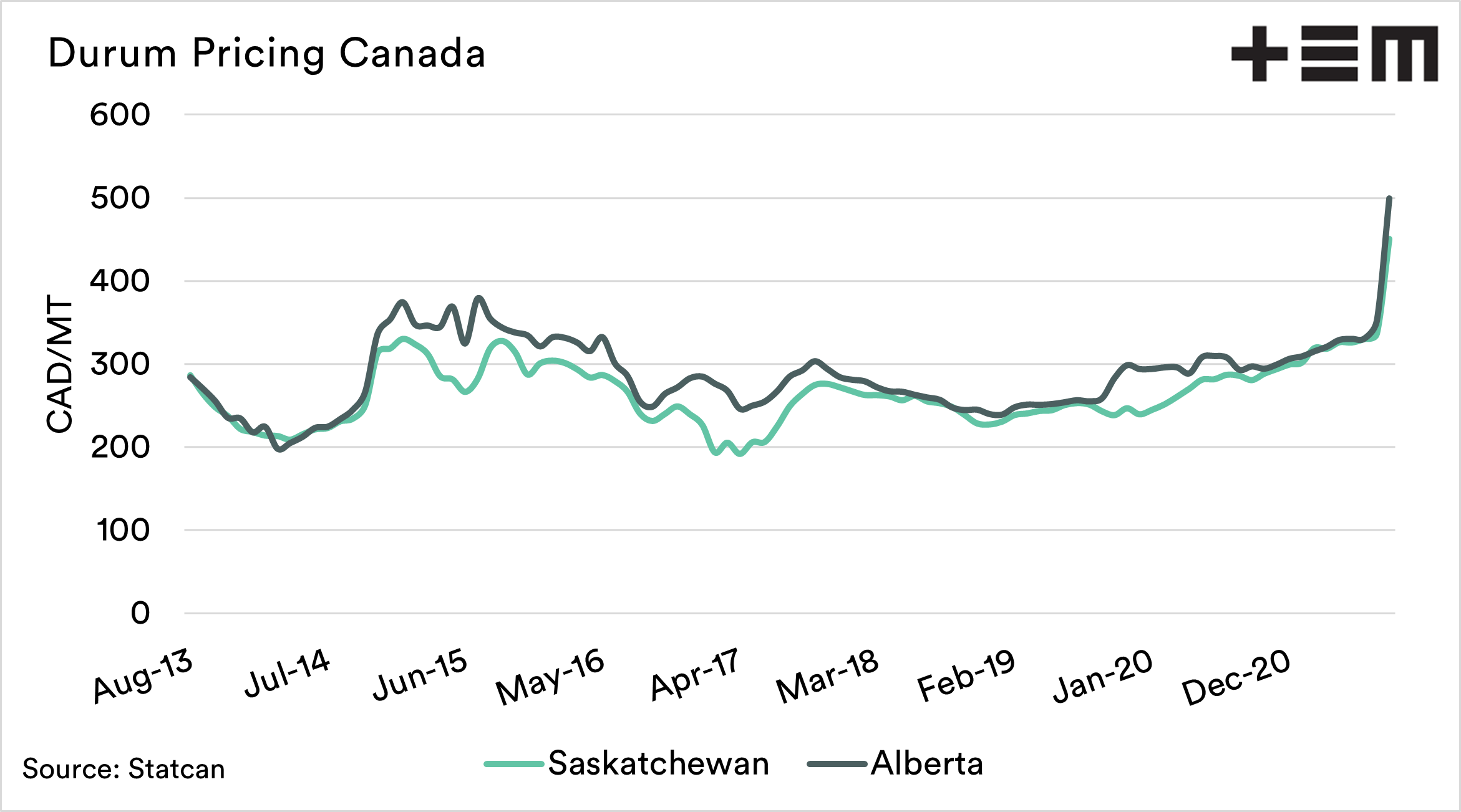 The first chart below shows the scale of the rise in pricing of durum in Canada. As we can see, their pricing levels have risen very steeply, to hit the highest levels since at least 2013.0