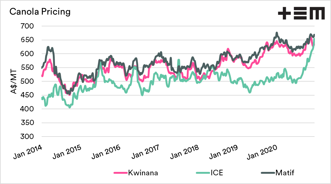 - Canadian ICE canola futures have rallied this year, and are currently higher than Australian pricing.
