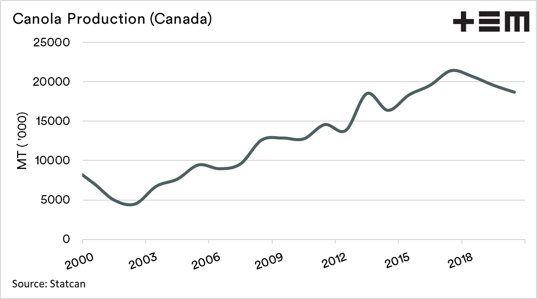 Canada canola production declined during 2020, to his 18.72mmt, the third consecutive year of falls. This places canola production at the lowest level since 2015.