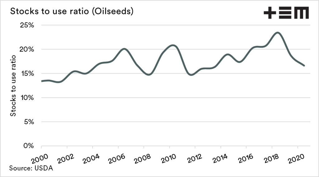 - The oilseed stocks to use ratio has declined from a record 23% in 2018 to a substantially tighter 17% this year.