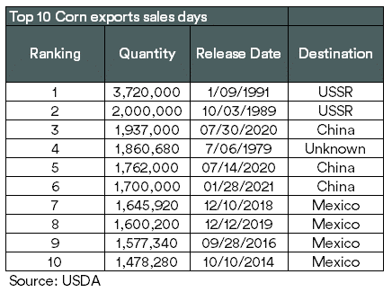 Expectations from EP3 analysts in early 2020 were that corn exports to China would be up in 2020 & 2021 due to the phase 1 deal (see here). This massive increase in Chinese buying in recent months has seen China at no 3, 5 & 6 all since the middle of last year (see table).