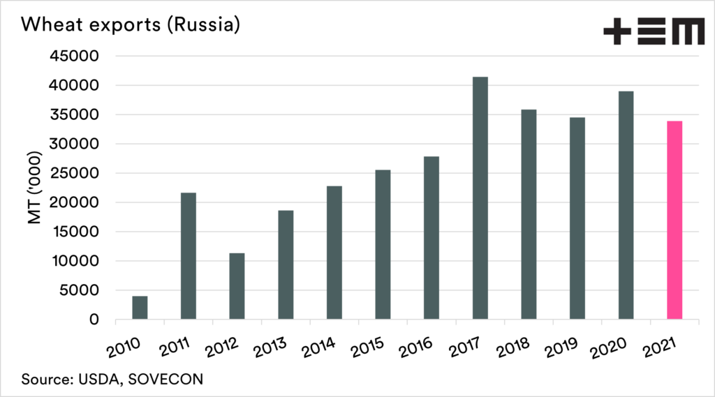 USDA estimates Russian 2021/22 Russia’s wheat exports at 35 mmt.