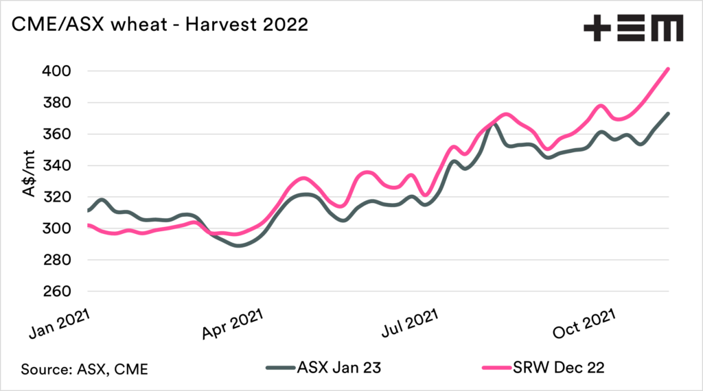 The second chart is the ASX Australian wheat contract vs Chicago. We can see that the basis on offer at present is negative. Historically, we only tend to have a negative basis during times of large production.