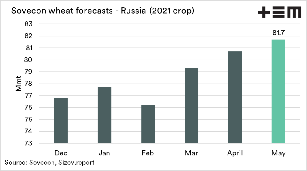 SovEcon, the leading Black Sea agricultural markets research firm, upped the 2021 Russian wheat crop forecast from 80.7mmt to 81.7mmt (85.9mmt in 2020, 85.3mmt ex. Crimea).
