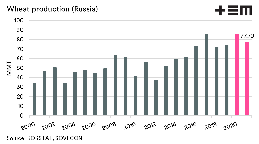 In 2020, Russia, #1 world wheat exporter, harvested 85.9 MMT of wheat (85.3 MMT ex Crimea).