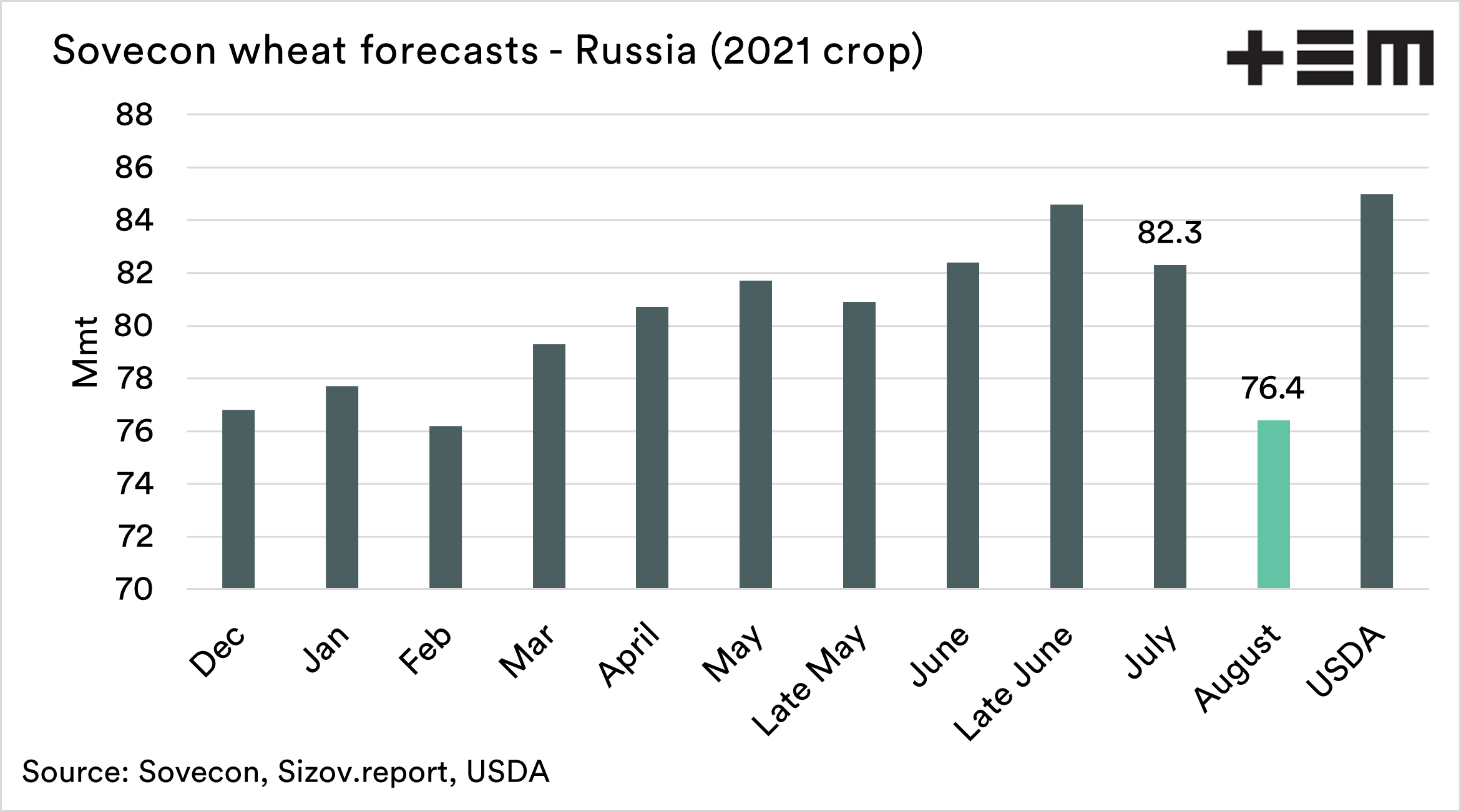 USDA estimates the Russian wheat crop at 85 mmt (ex. Crimea which will produce around 0.7-0.8 mmt).