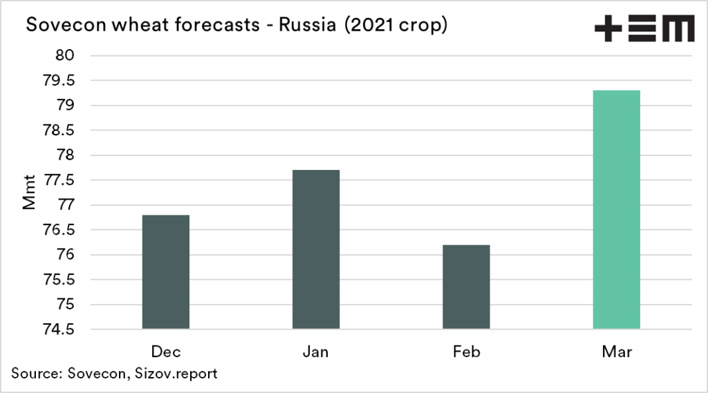 SovEcon, a leading Black Sea agricultural markets research firm, upped 2021 Russia’s wheat crop forecast from 76.2 MMT to 79.3 MMT.