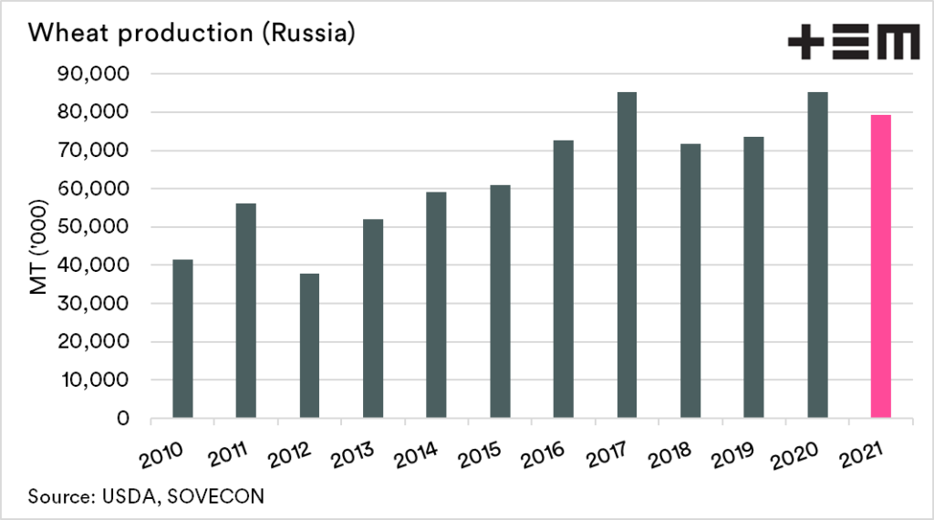 In 2020 Russia harvested 85.9 MMT of wheat (85.3 ex Crimea), Ukraine produced 25 MMT of wheat.