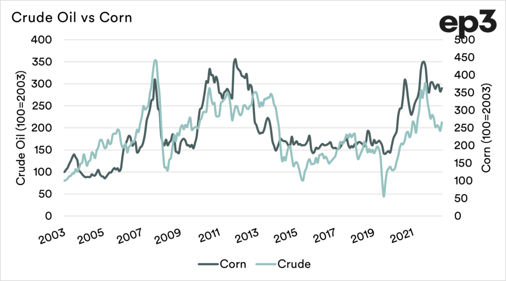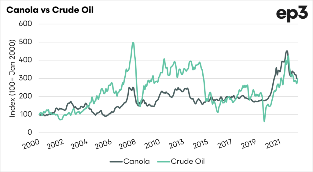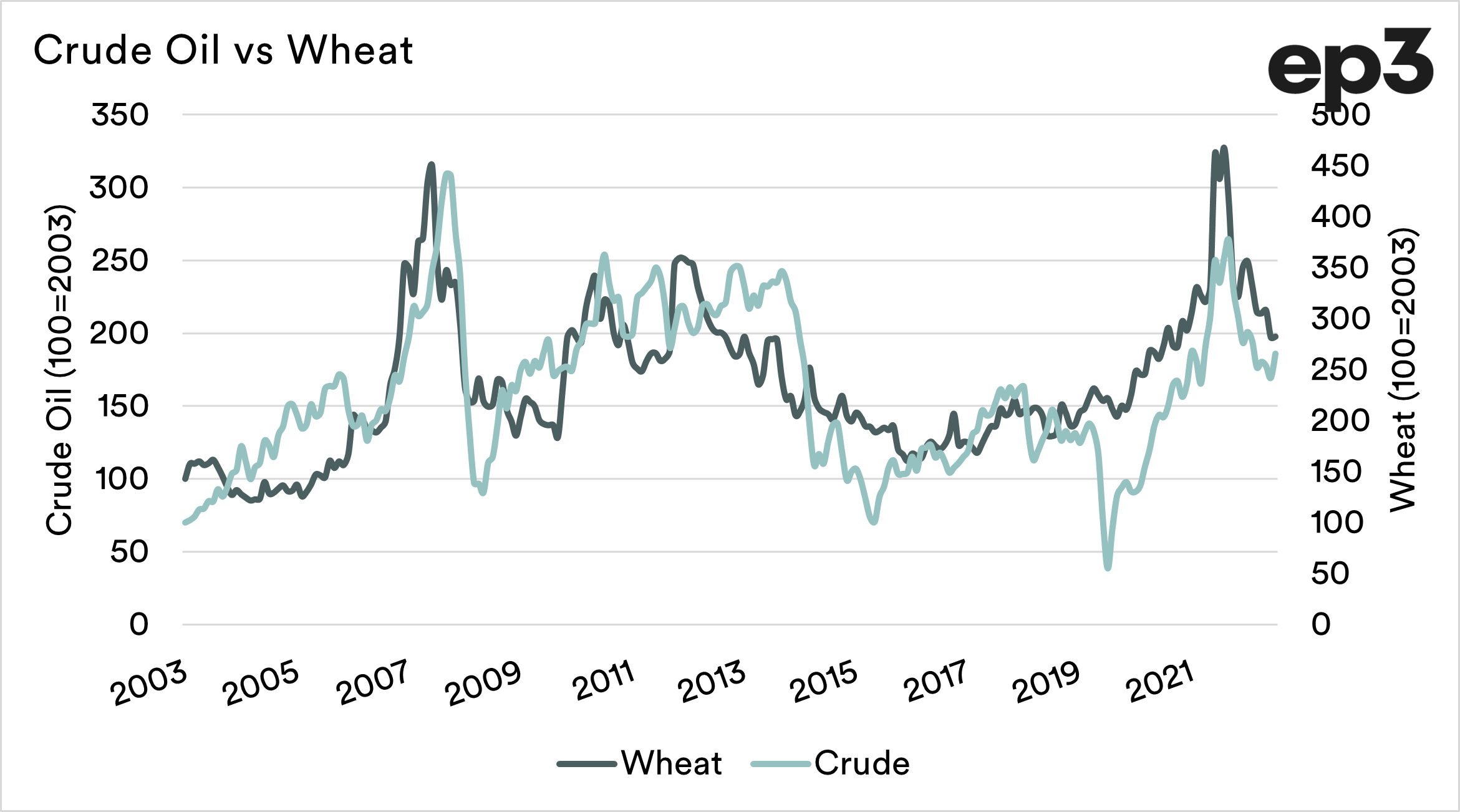 This is going to have an effect on products which require oil (or the wider energy complex). However, we have seen a strong trend of grain and oilseed prices following crude oil. I have wrote about some of the reasons behind this here.