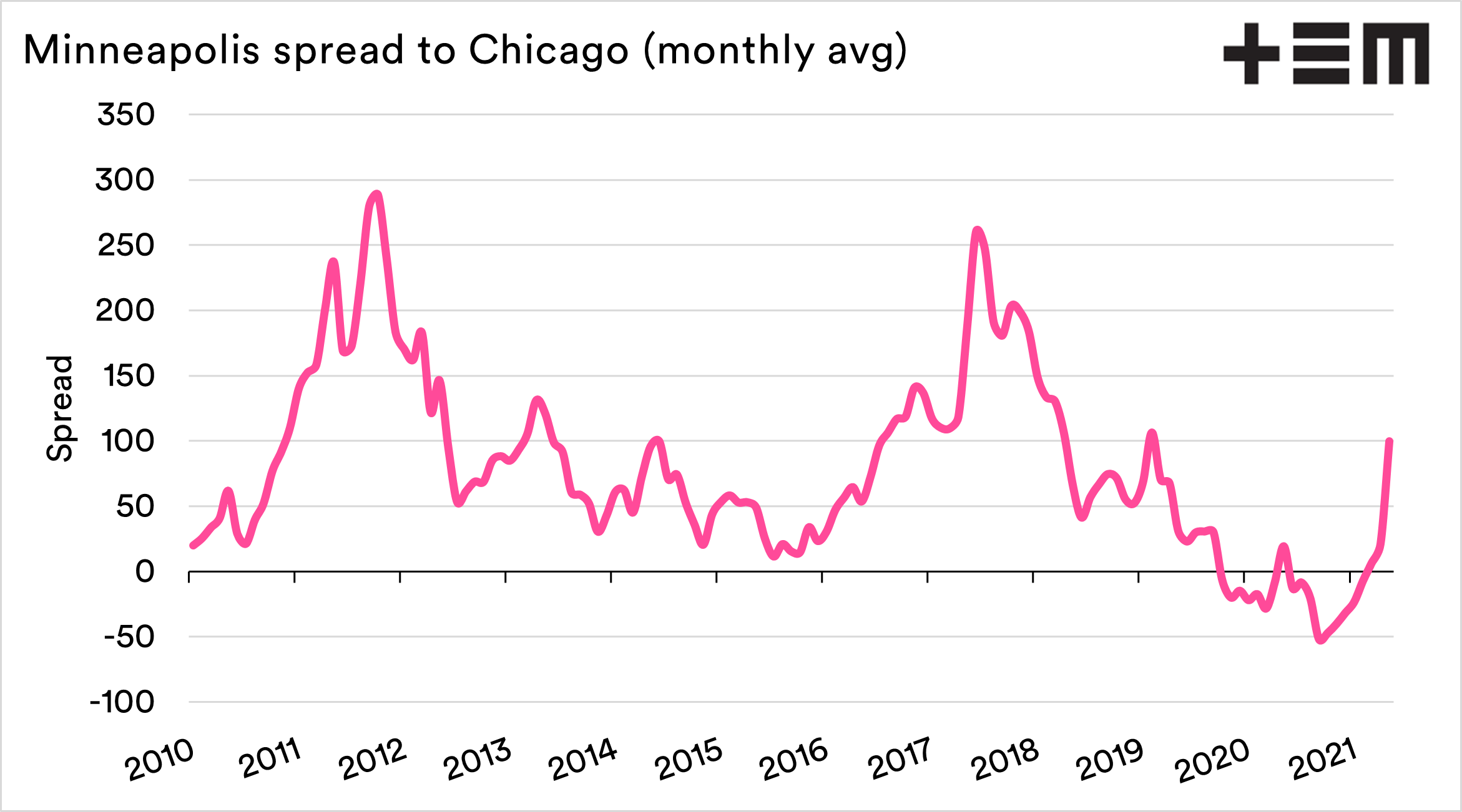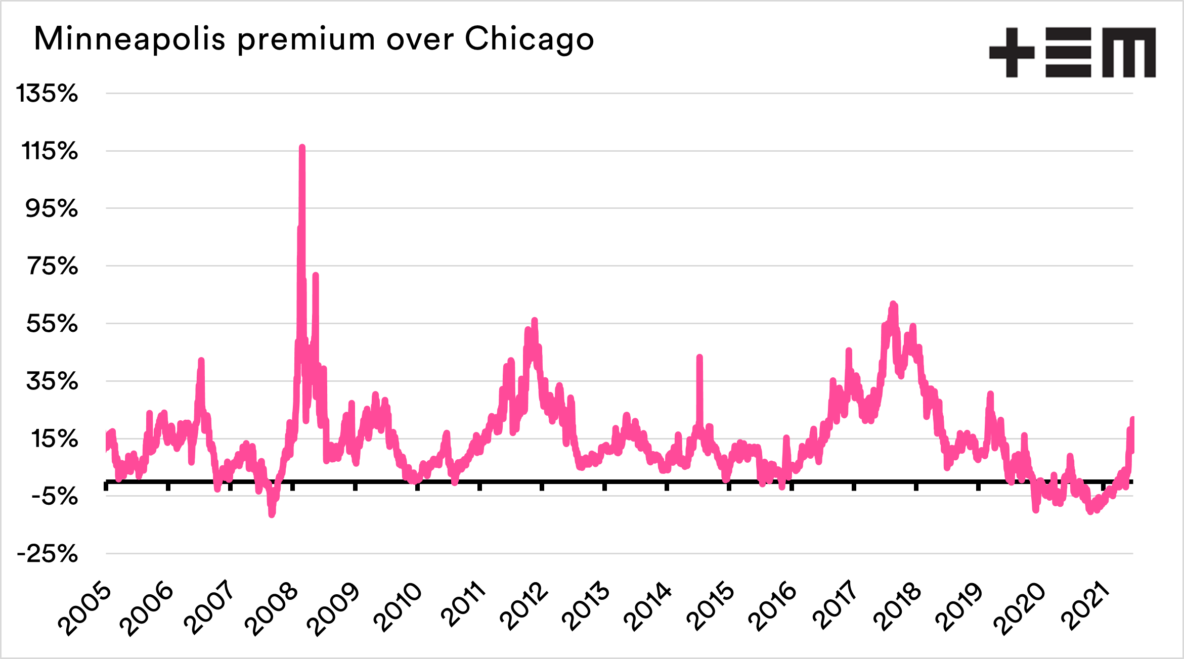 Despite the rise in premium during the past month, the rise has not been as strong as previous spring wheat rallies during the past 15 years. There might still be value in this as a spread trade.