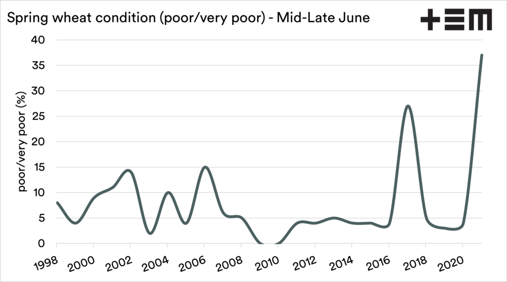At present, 37% of the crop is rated as poor/very poor, a sorry state. This is the worst condition that the crop has been in at this time of the year since the late ’80s.