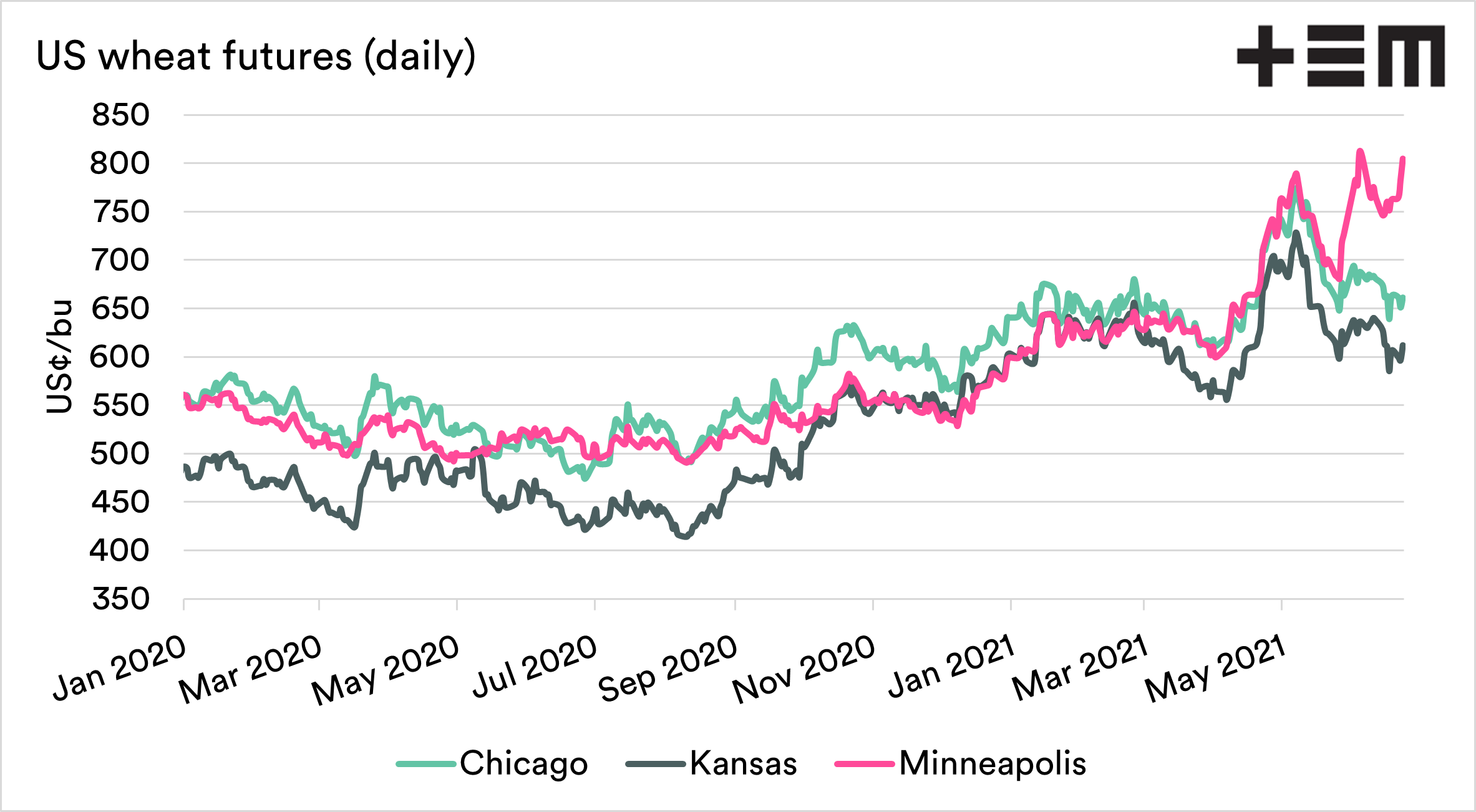 The result has been that spring wheat futures have risen to a solid premium to Chicago and Kansas. Yesterday the premium from Minneapolis to Chicago was 21%. At the start of May, the premium was 4%.
