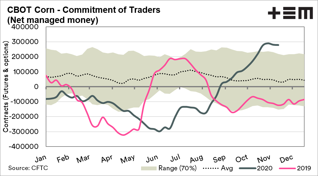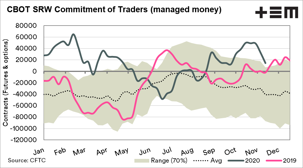 Their position on corn has remained buoyant in recent weeks, with their net position remaining relatively static. This is due to the bullish data on corn continuing, whilst wheat has turned neutral.