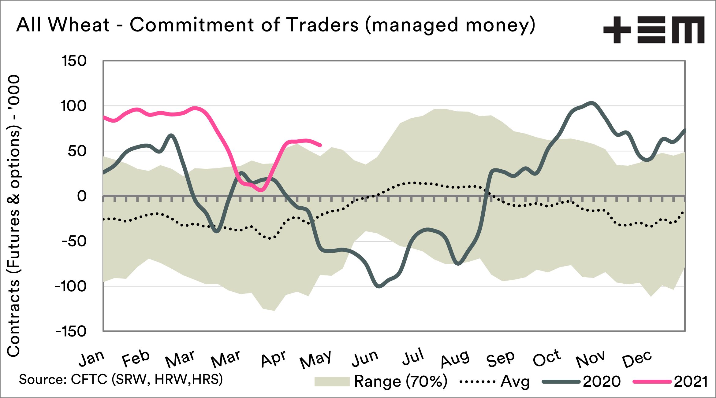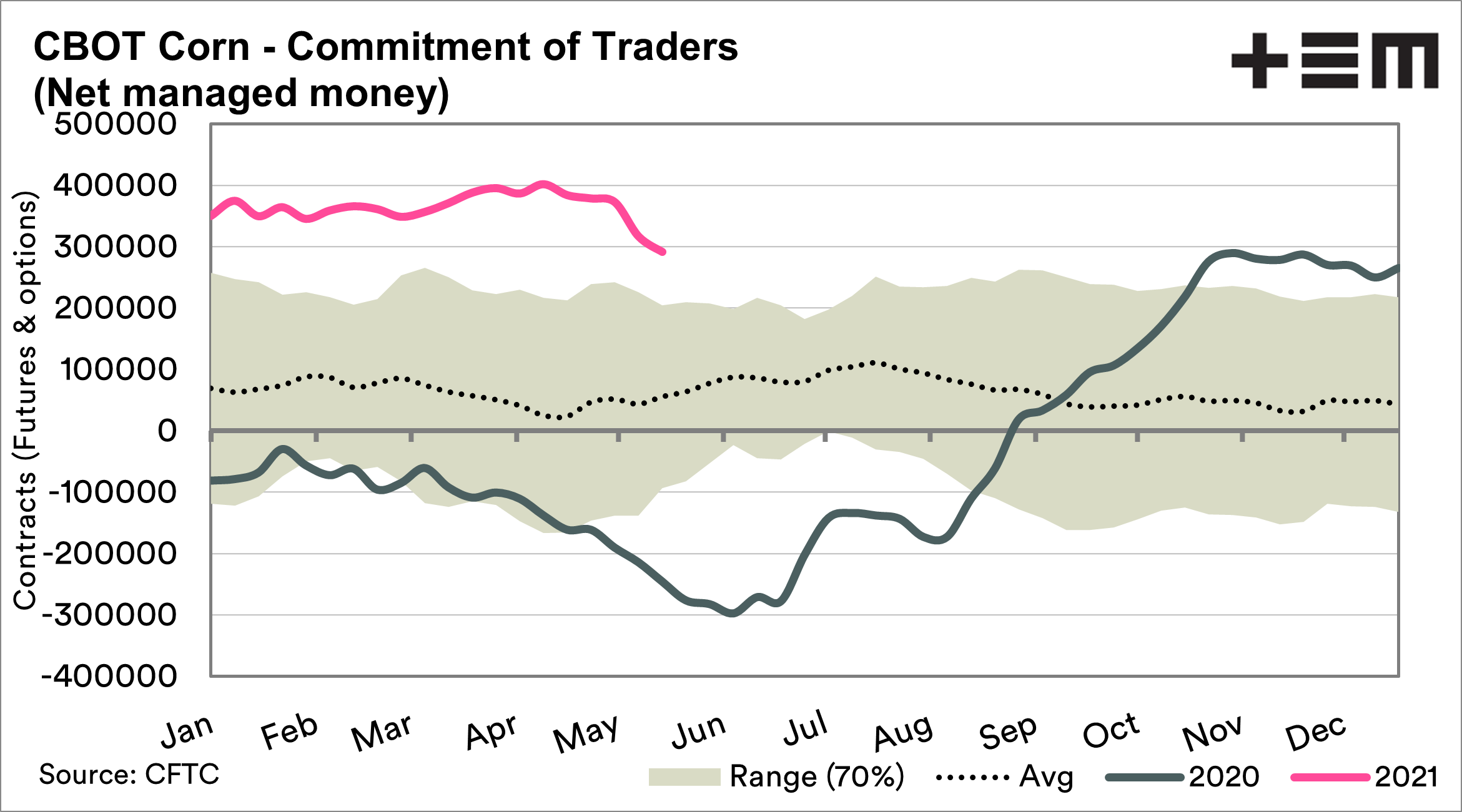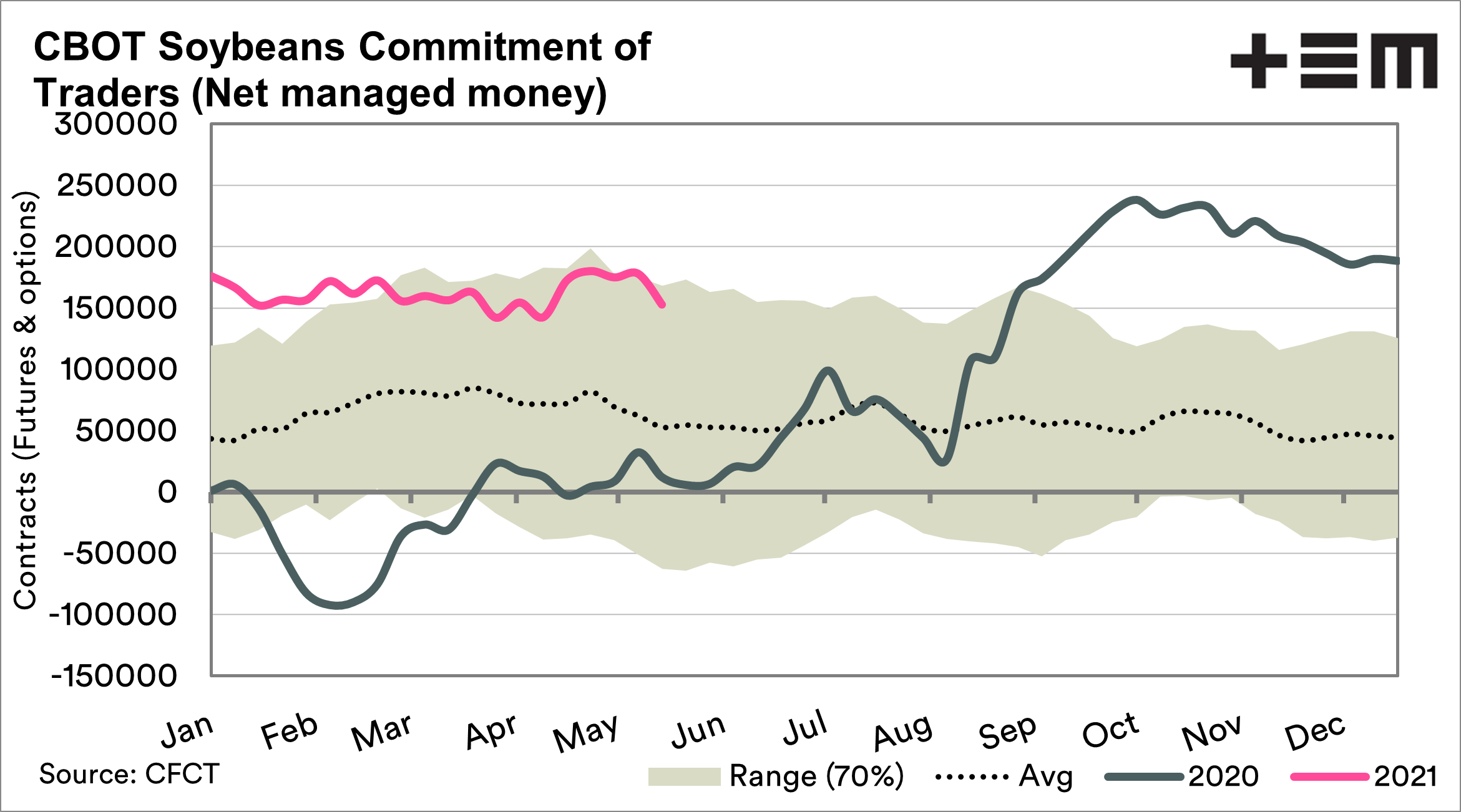 The speculators in the market have sold down large volumes in recent weeks. They have reduced their long position each week of the past five. This week the overall position dropped by 25k contracts and 56k the week prior.