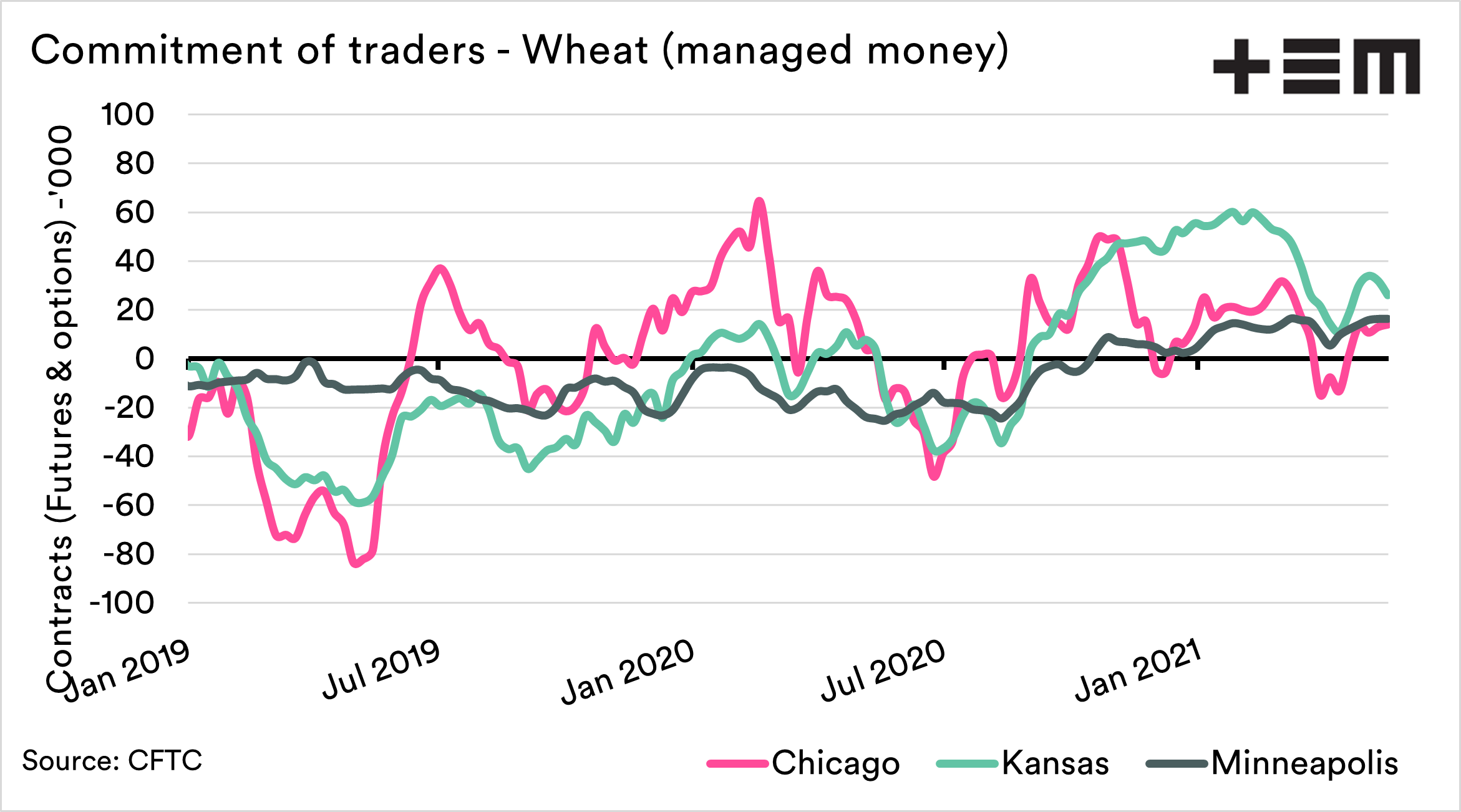Wheat: The overall position of wheat was relatively unchanged week on week. Speculators increased their bought (or long) position by 1k contracts, in Kansas they reduced by 6k, and in Minneapolis, they were largely unchanged.