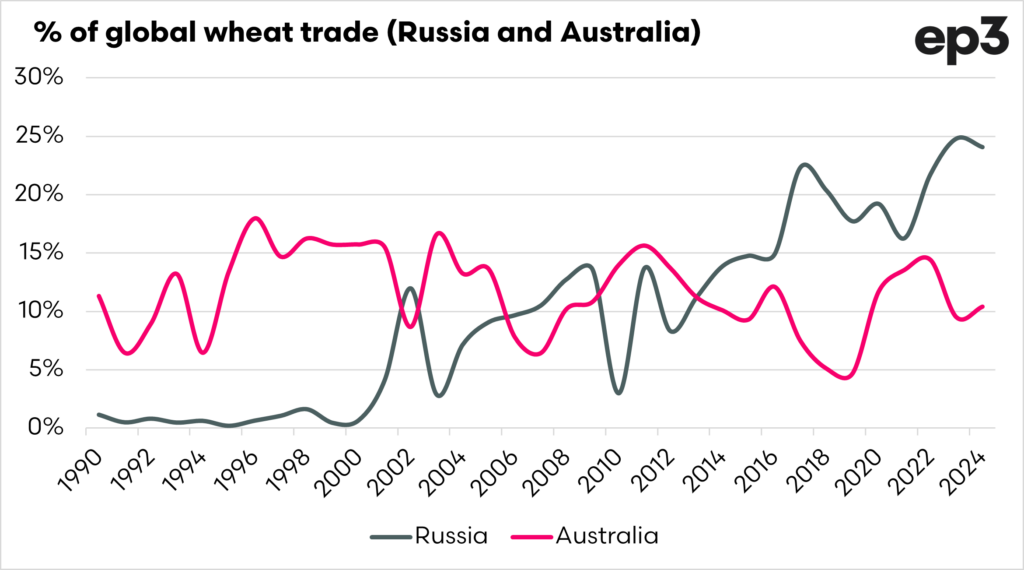 We regularly discuss the importance of Russia. The chart below highlights Russia’s rise, from around 1% of the global trade in wheat in 1990 to 25% in recent years. During 2022, Australia provided around 15% of the world’s wheat in one of our highest years of production.