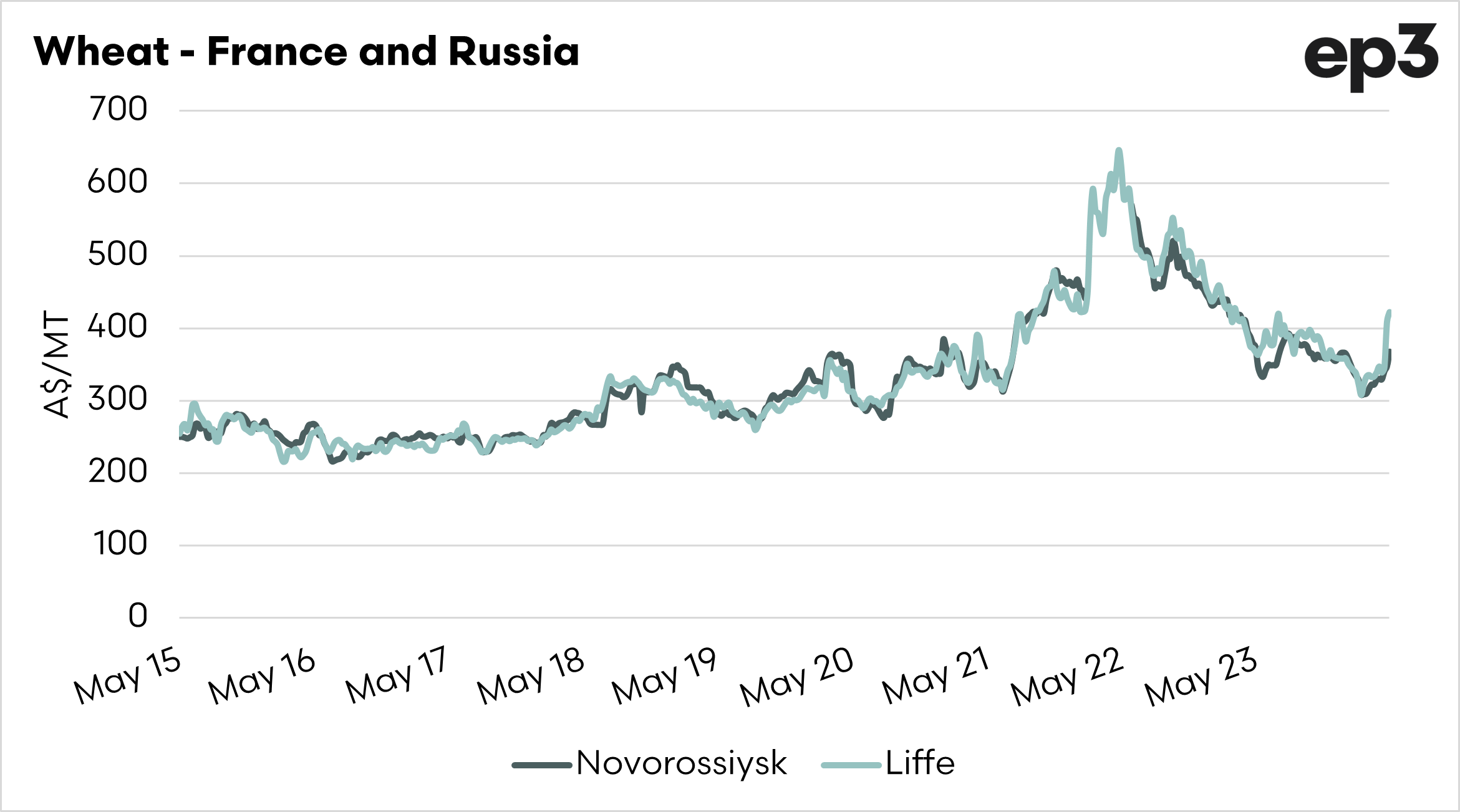 The MATIF wheat contract is based in France, and is generally used as a proxy for European wheat. As all wheat markets are interconnected, we can expect to see a relationship between Russian and French wheat pricing.