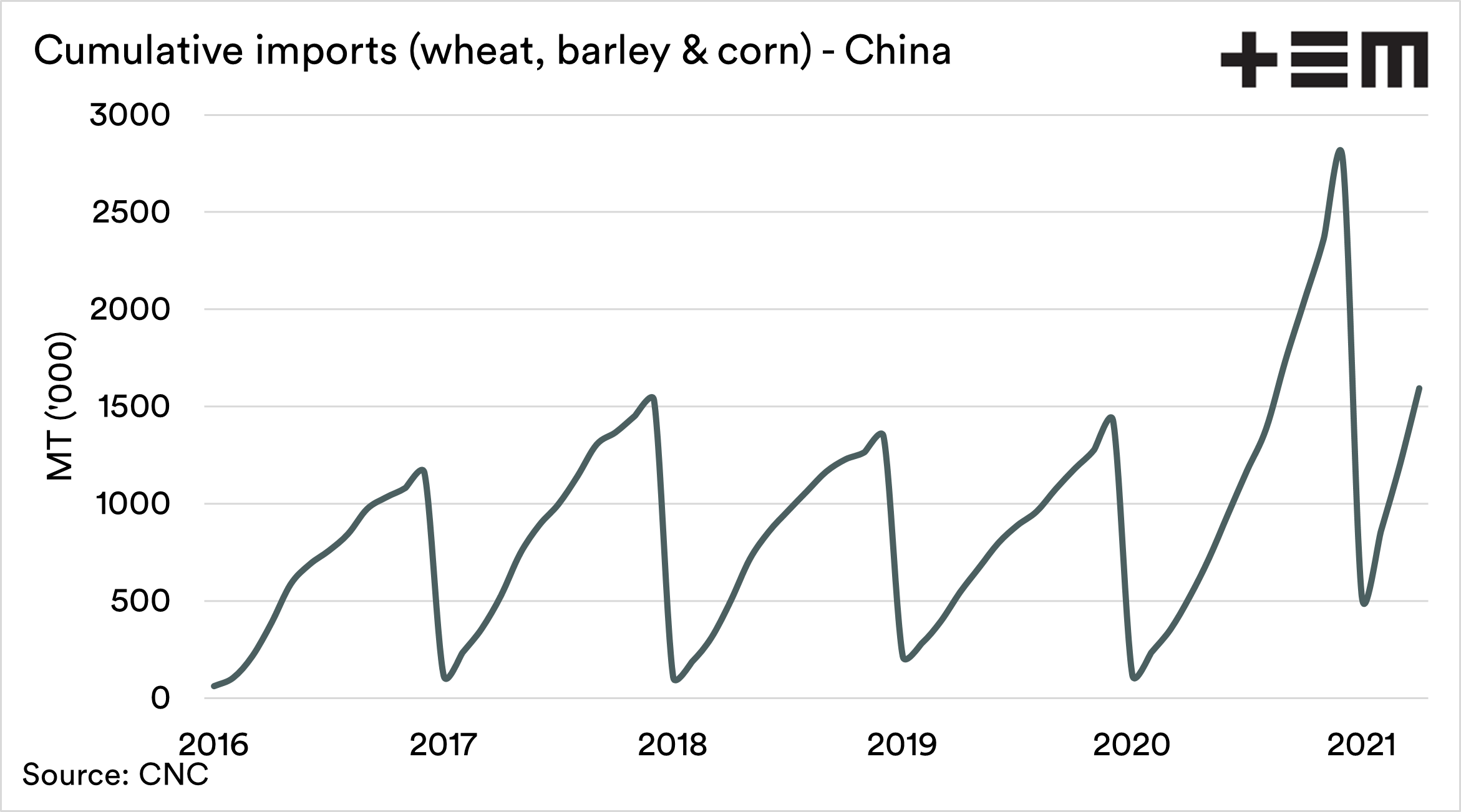 Chinese demand for grains has grown in the past year and a half. At the end of April, China has already imported more grain (combined wheat, barley & corn) than the year totals for 2016-2019.