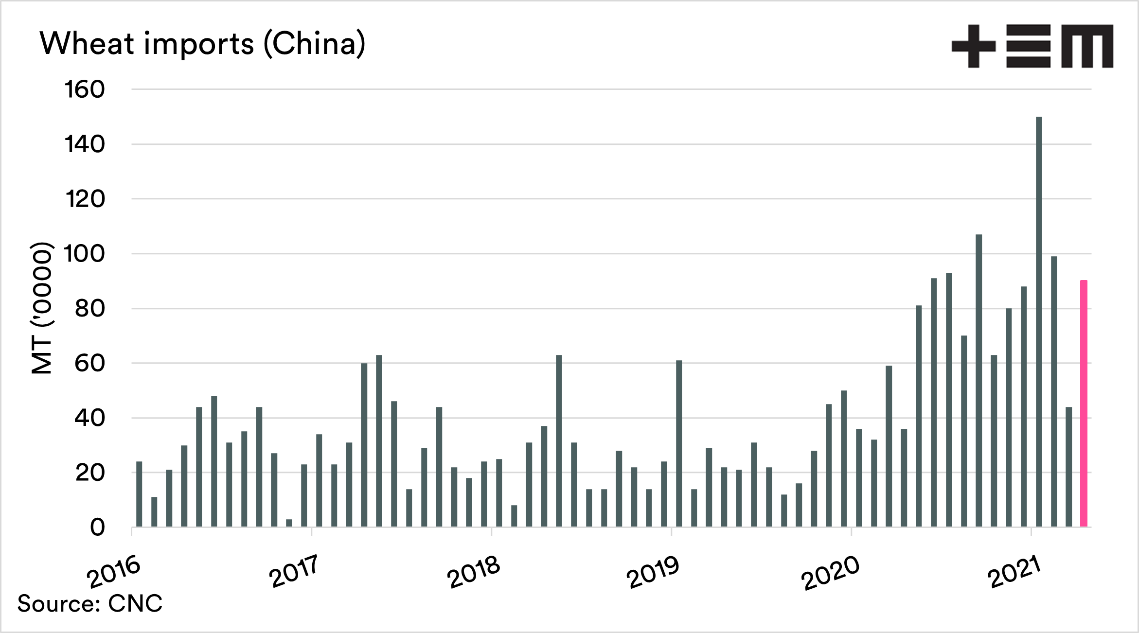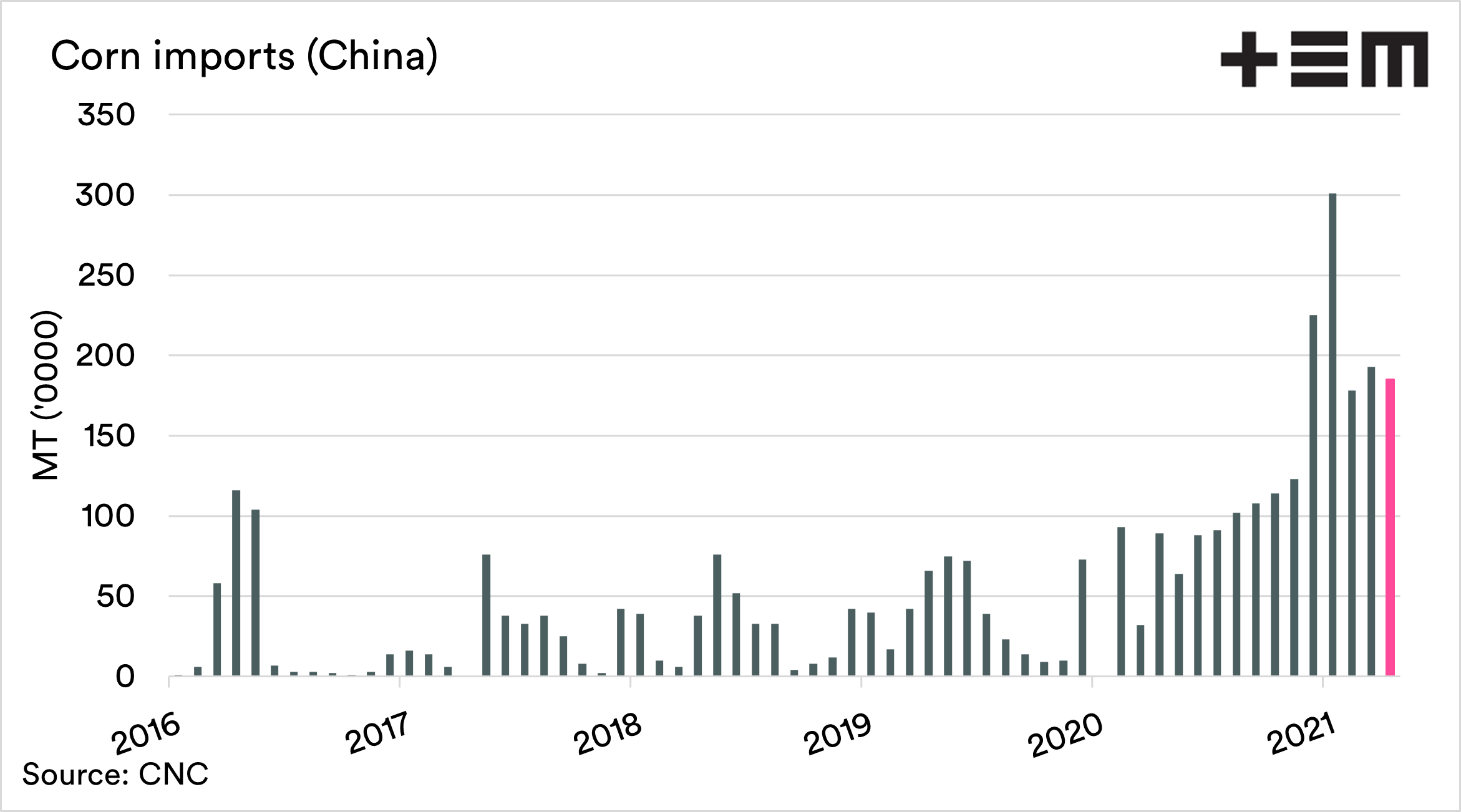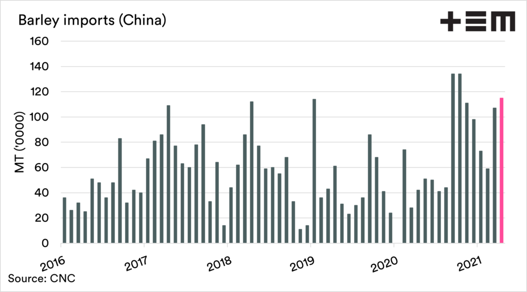 We remain locked out of China for our barley. However, this hasn’t stopped China from making large purchases. According to Chinese government import data, they imported 1.15mmt of barley during April. This is the second-largest volume, behind the joint first place months of Sep/Oct 2020 when 1.34mmt was imported.