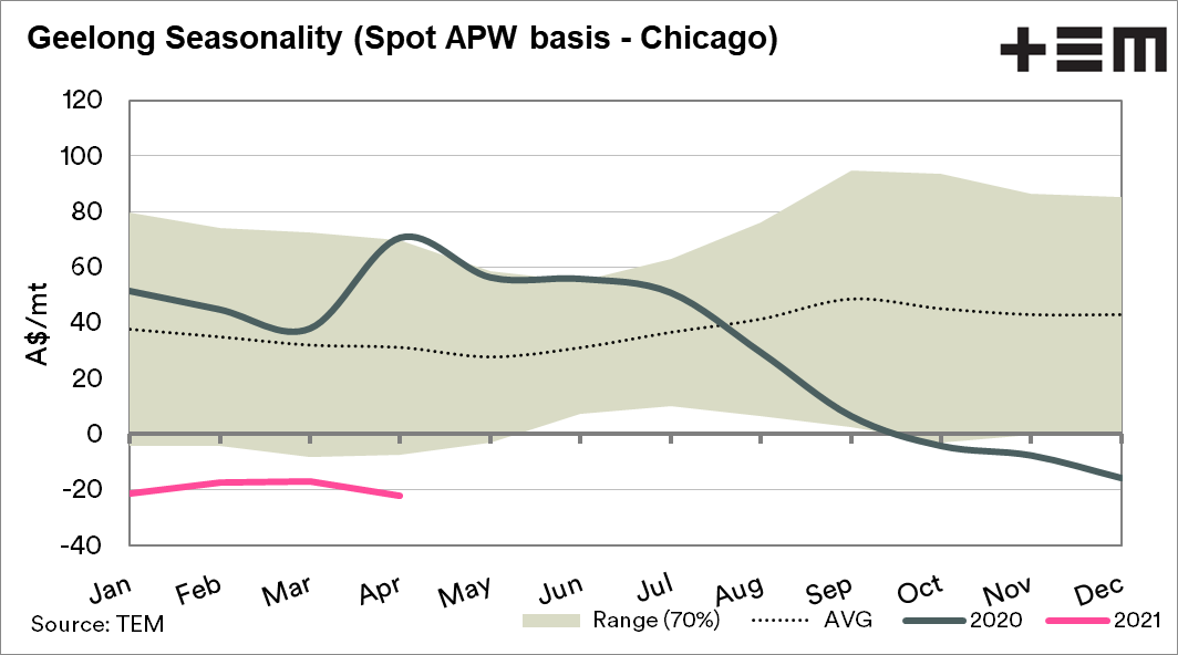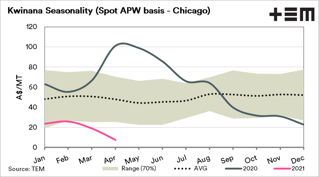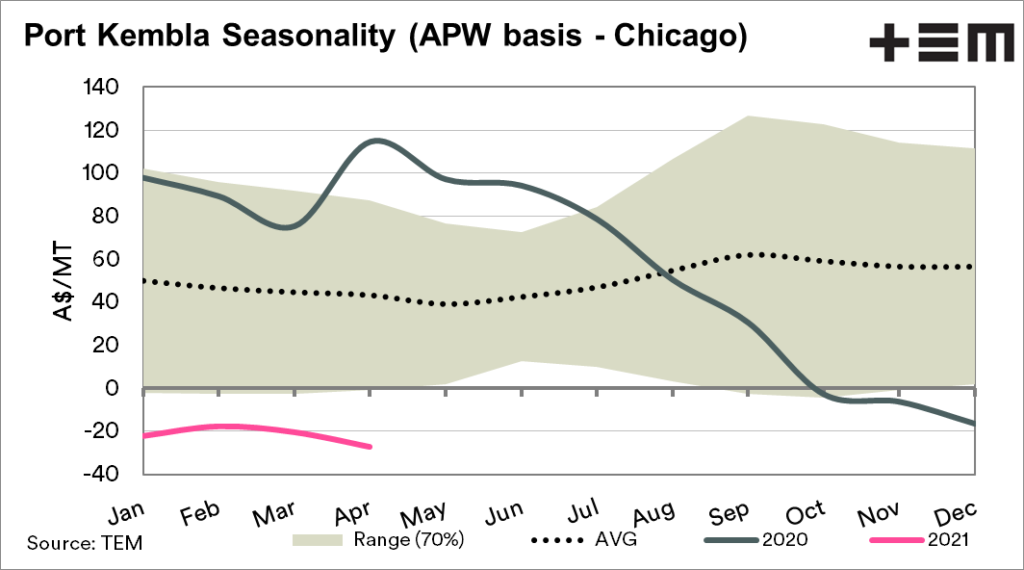 The negative basis makes sense and is one of the issues which we flagged ahead of harvest (see here). A large crop that supplies ample for domestic needs and export capacity, results in a lower basis level.
