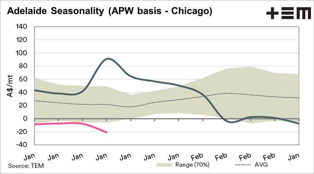 Old crop wheat basis is a tale of two sides. Western Australia, whilst experiencing a declining basis, has remained positive. On the other hand, the east coast has remained at a negative level throughout the period from harvest.