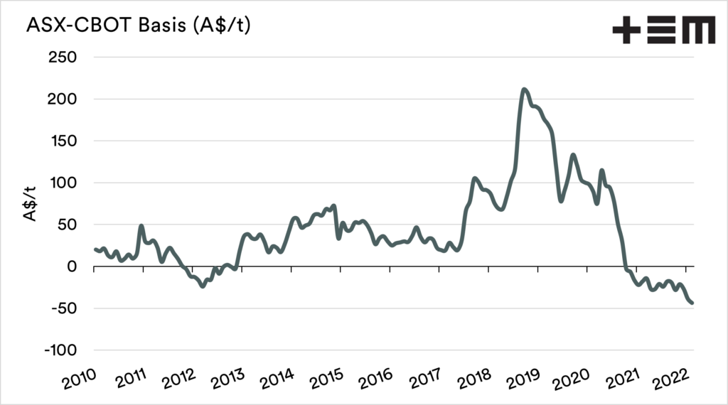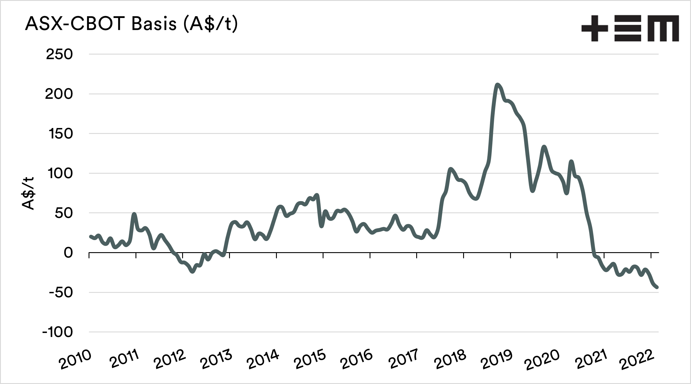 The second chart shows basis between ASX and CBOT wheat from 2010 to the present. It is important to note that the basis has to be added/subtracted from this. At the moment, we are experiencing a negative basis (learn more about basis here).
