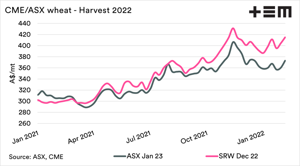 The third chart shows ASX January 2023 wheat contract against the CBOT wheat December 2022, the coming harvest. As we can see, the ASX contract, which correlates well with physical bids, is trading at a large discount.