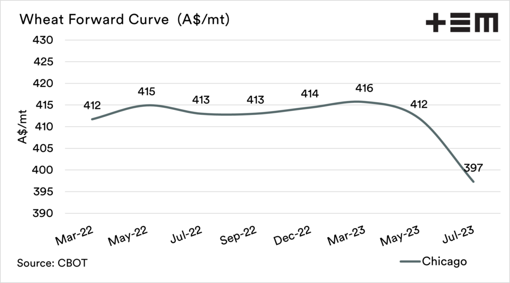 Let’s have a look at what is on offer for next season. The first chart below shows the forward curve for Chicago wheat futures, expressed in A$. The curve is much flatter than normal. At present, it is possible to lock in your wheat’s futures/fx component through your bank at A$414* for the next harvest.