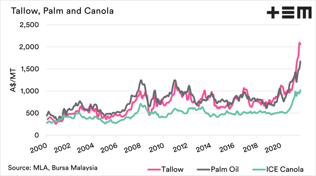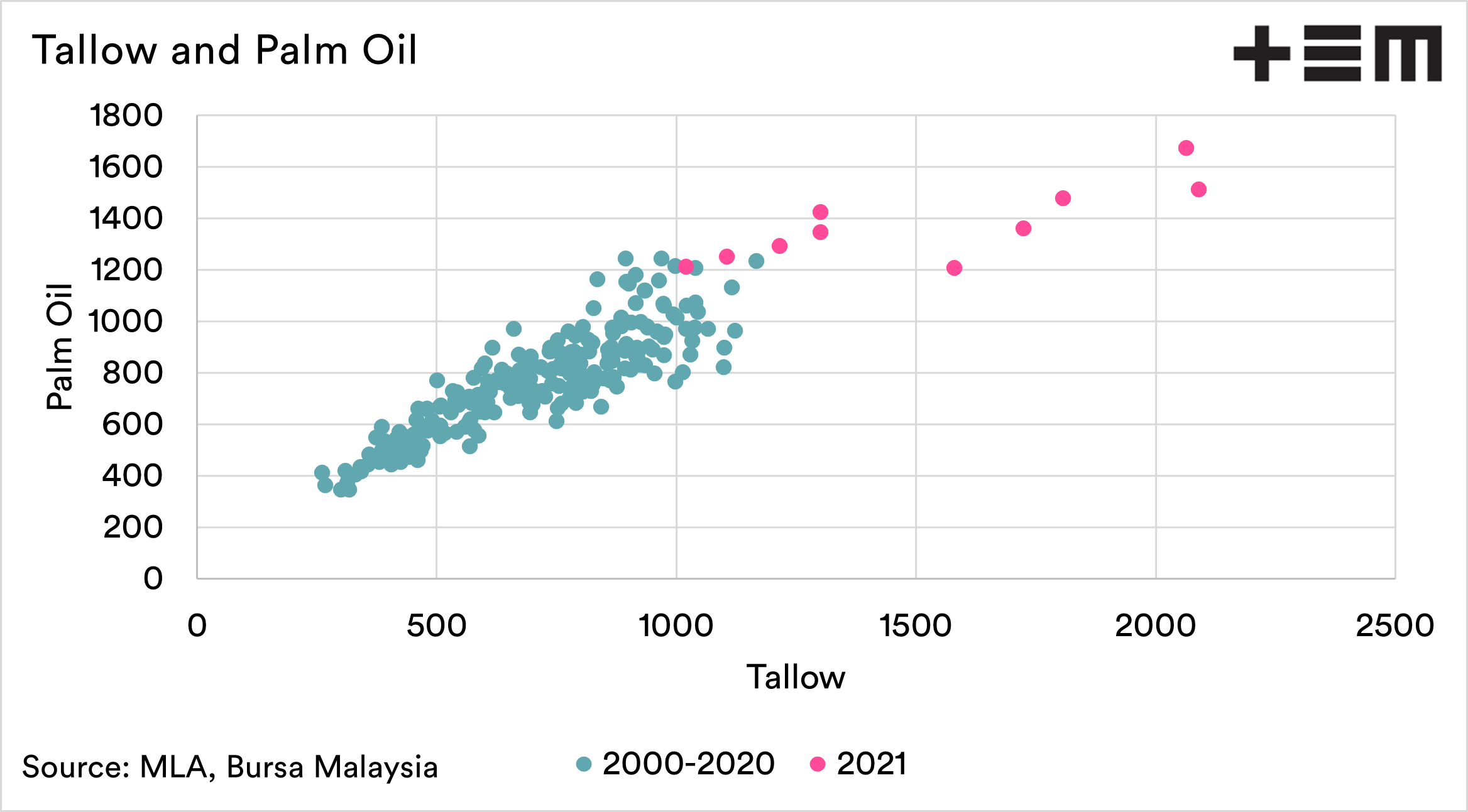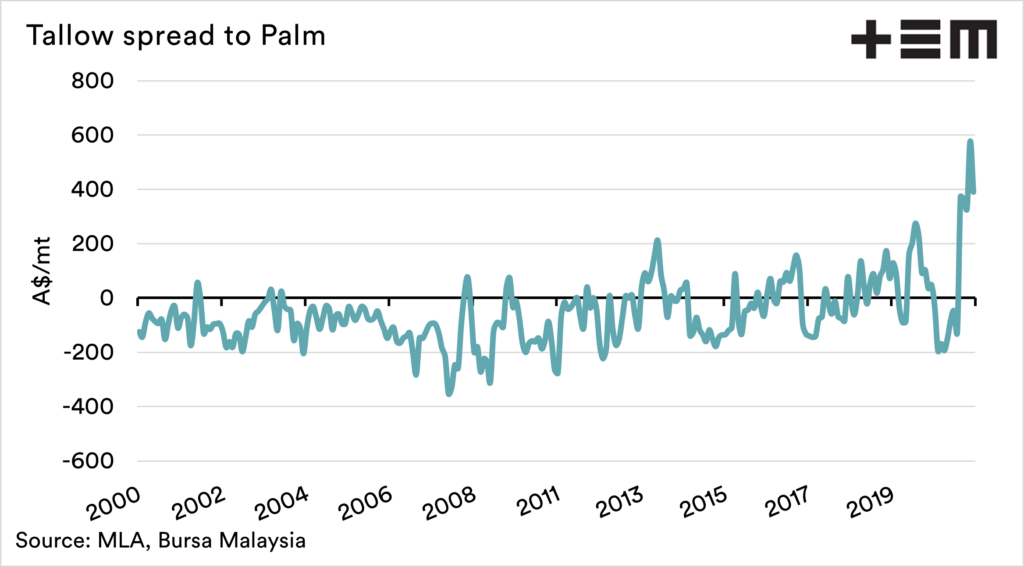 The relationship is close because they are both in the same subset of commodities that have similar uses. This year, we have seen that the price of tallow has increased and moved to a very strong premium to palm. We expected that tallow would hit record levels back in May (read Offally Expensive)